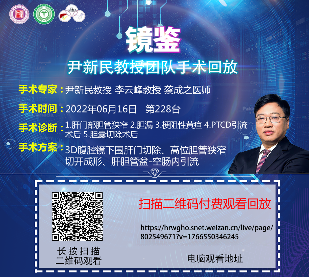 尹新民教授团队228台|"3D腹腔镜下围肝门切除、高位胆管狭窄切开成形、 肝胆管盆-空肠内引流"|1.肝门部胆管狭窄 2.胆漏 3.梗阻性黄疸 4.PTCD引流术后 5.胆囊切除术后|20220616