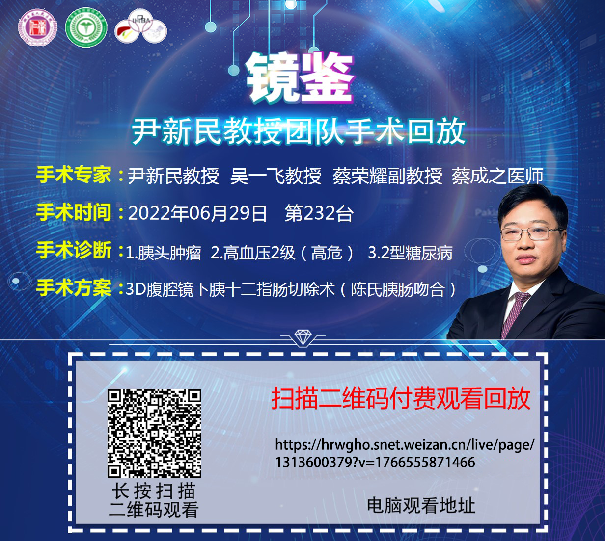 尹新民教授团队232台|3D腹腔镜下胰十二指肠切除术|"1.胰腺占位:胰腺导管内乳头状粘液瘤?囊腺瘤?囊腺Ca? 2.高血压2级(高危) 3.2型糖尿病"|20220629