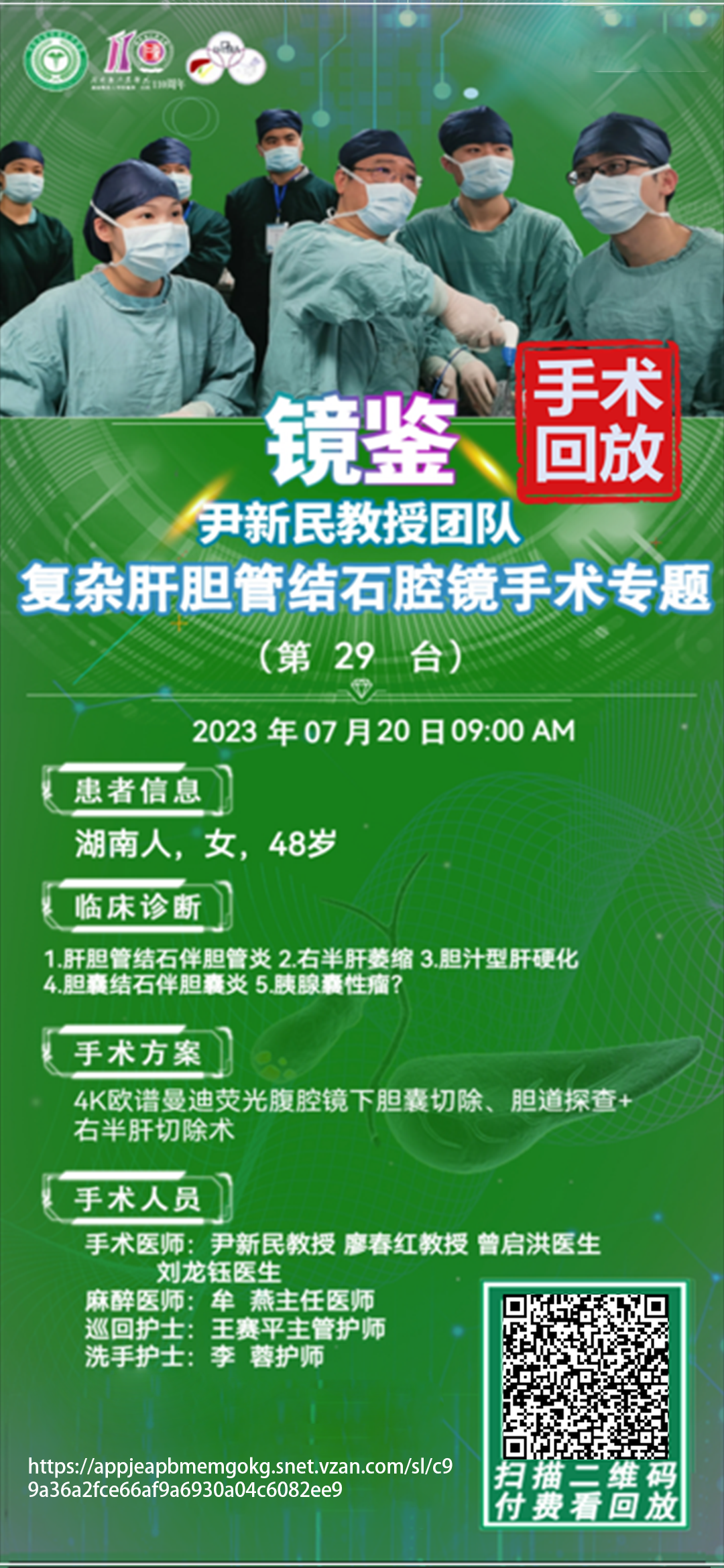 尹新民教授团队结石第29台|1.肝内胆管结石并胆管扩张 2.右肝萎缩 4.胆汁型肝硬化 5.胰尾部囊性占位:囊腺瘤? |4K欧谱曼迪荧光腹腔镜下右半肝切除+胆切胆探术|20230720