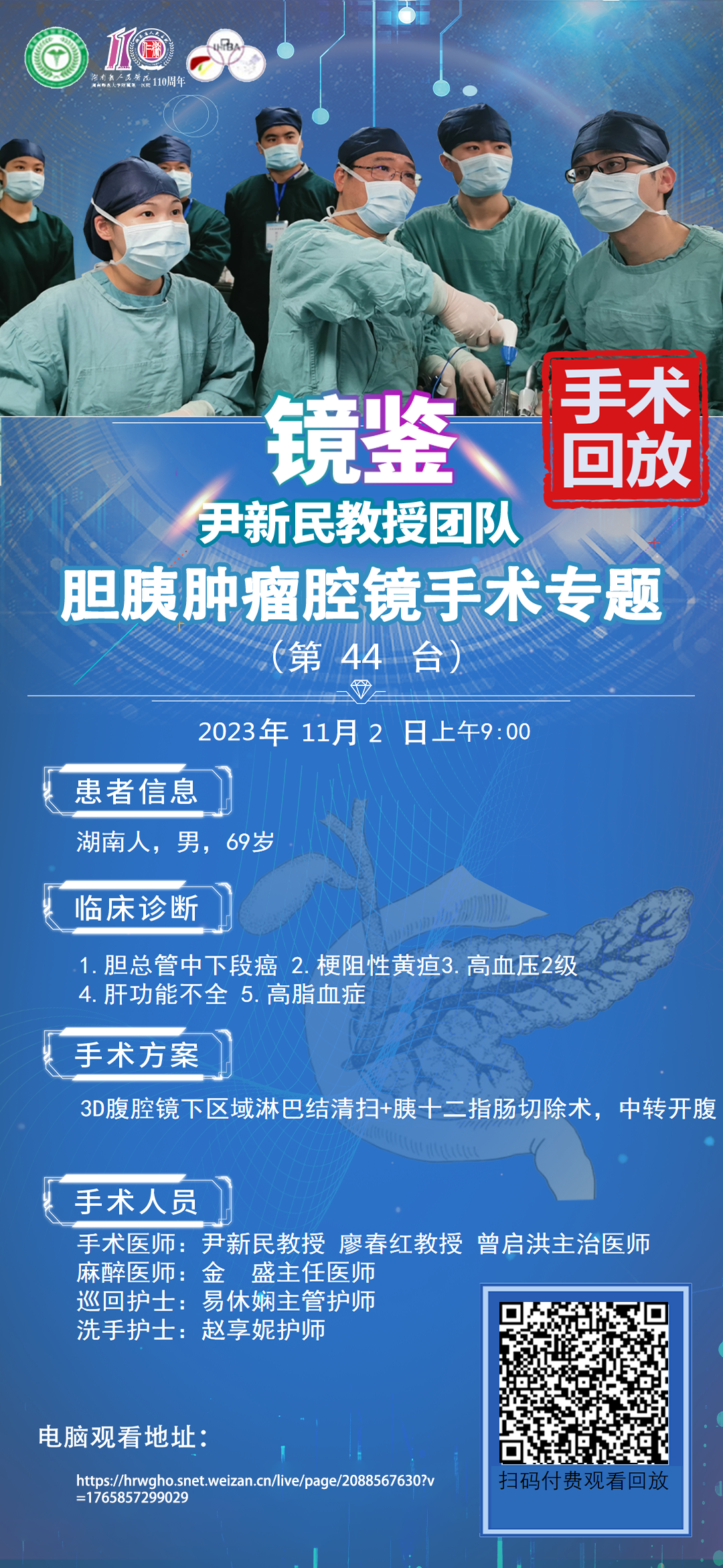 尹新民教授团队-四期胆胰肿瘤腔镜手术-第44台|3D腹腔镜下区域淋巴结清扫+胰十二指肠切除术,中转开腹1.胆总管中下段癌 2.梗阻性黄疸3.高血压2级 4.肝功能不全 5.高脂血症|20231102