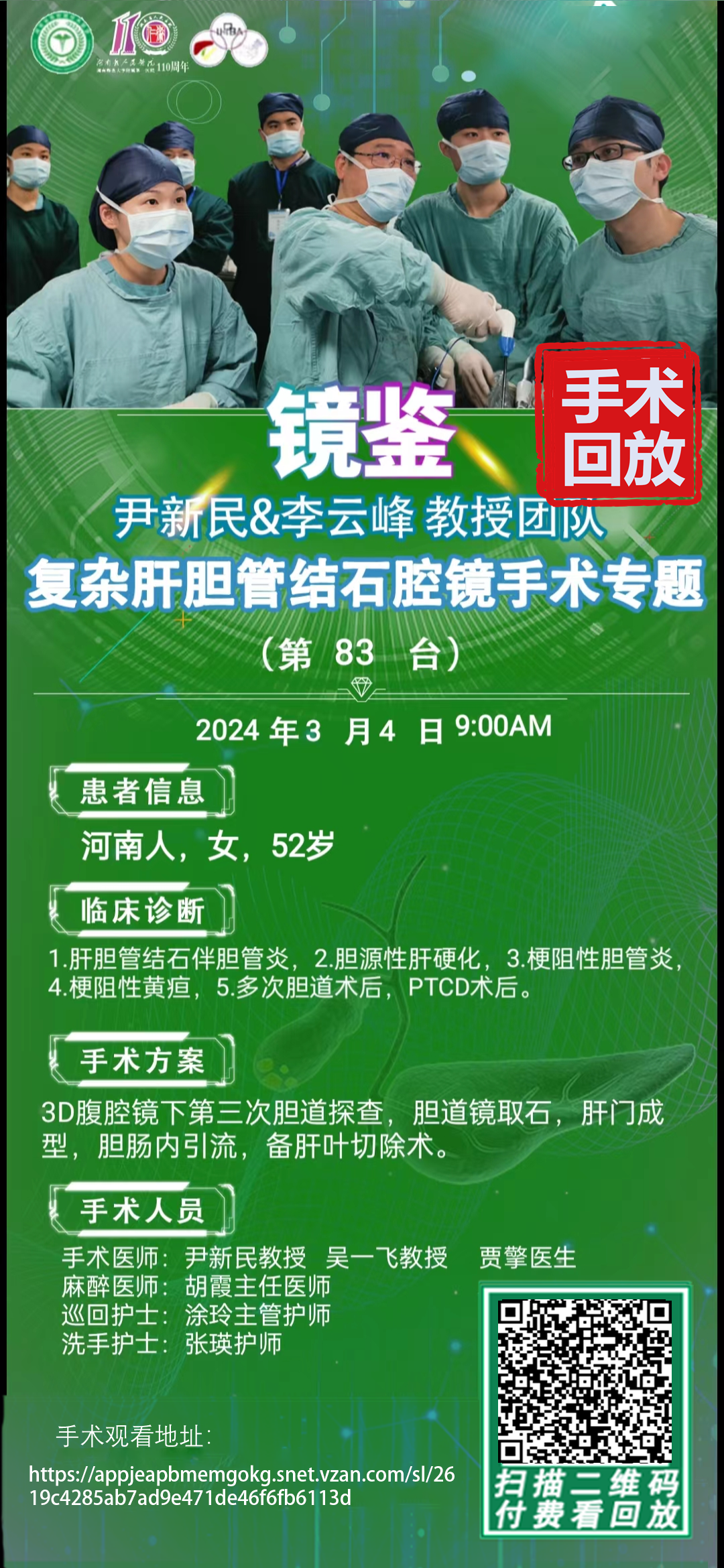 尹新民&李云峰团队复杂肝胆管结石腔镜手术-第83台|1肝胆管结石2胆源性肝硬化3梗阻性胆管炎4多次胆道术|3D腹腔镜下第三次胆道探查,胆道镜取石,肝门成型,胆肠内引流,备肝叶切除术|20240304