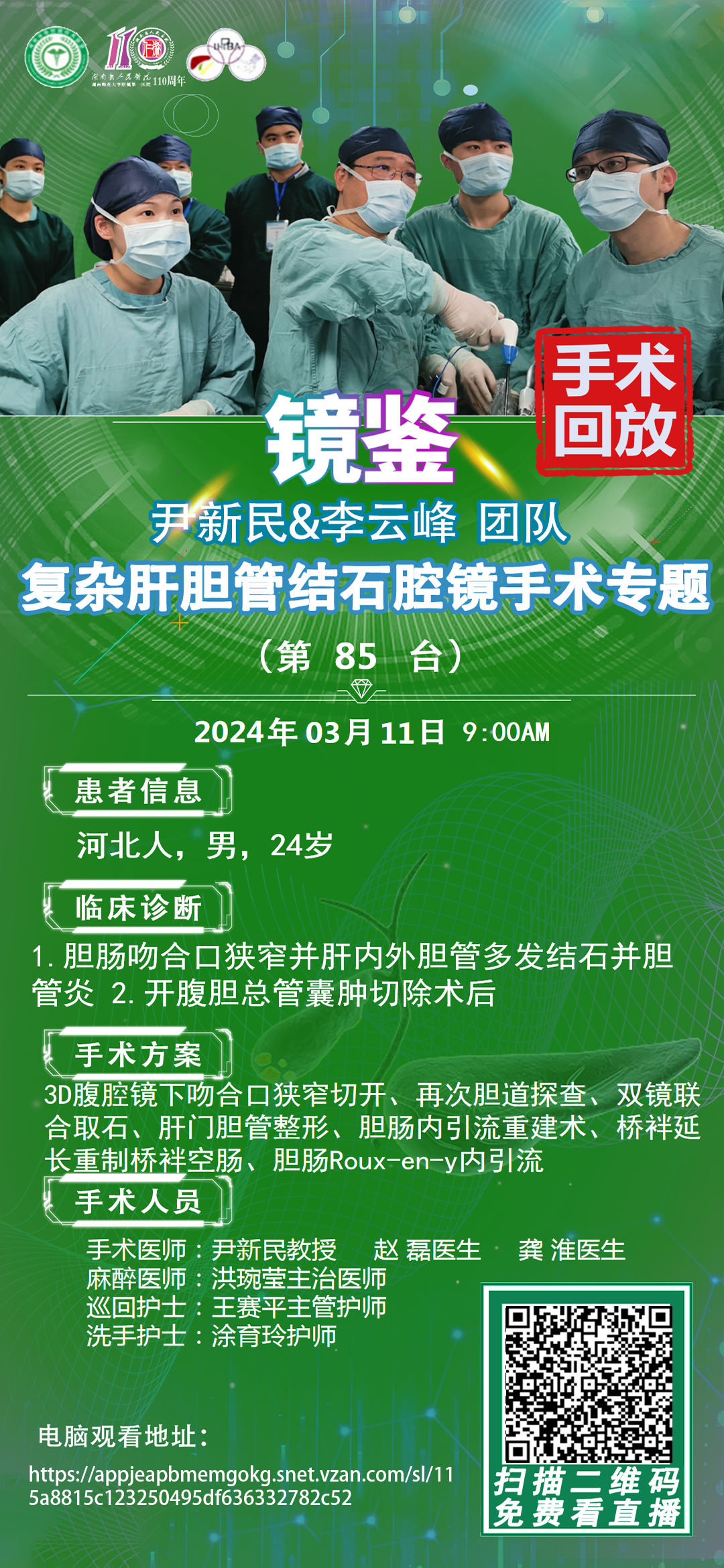尹新民教授团队复杂肝胆管结石第85台|3D腹腔镜下吻合口狭窄切开再次胆道探查双镜联合取石肝IVB段部分切除肝门胆管整形内引流重建术|胆肠吻合口狭窄并肝内胆管多发结石并胆管炎开腹|20240311