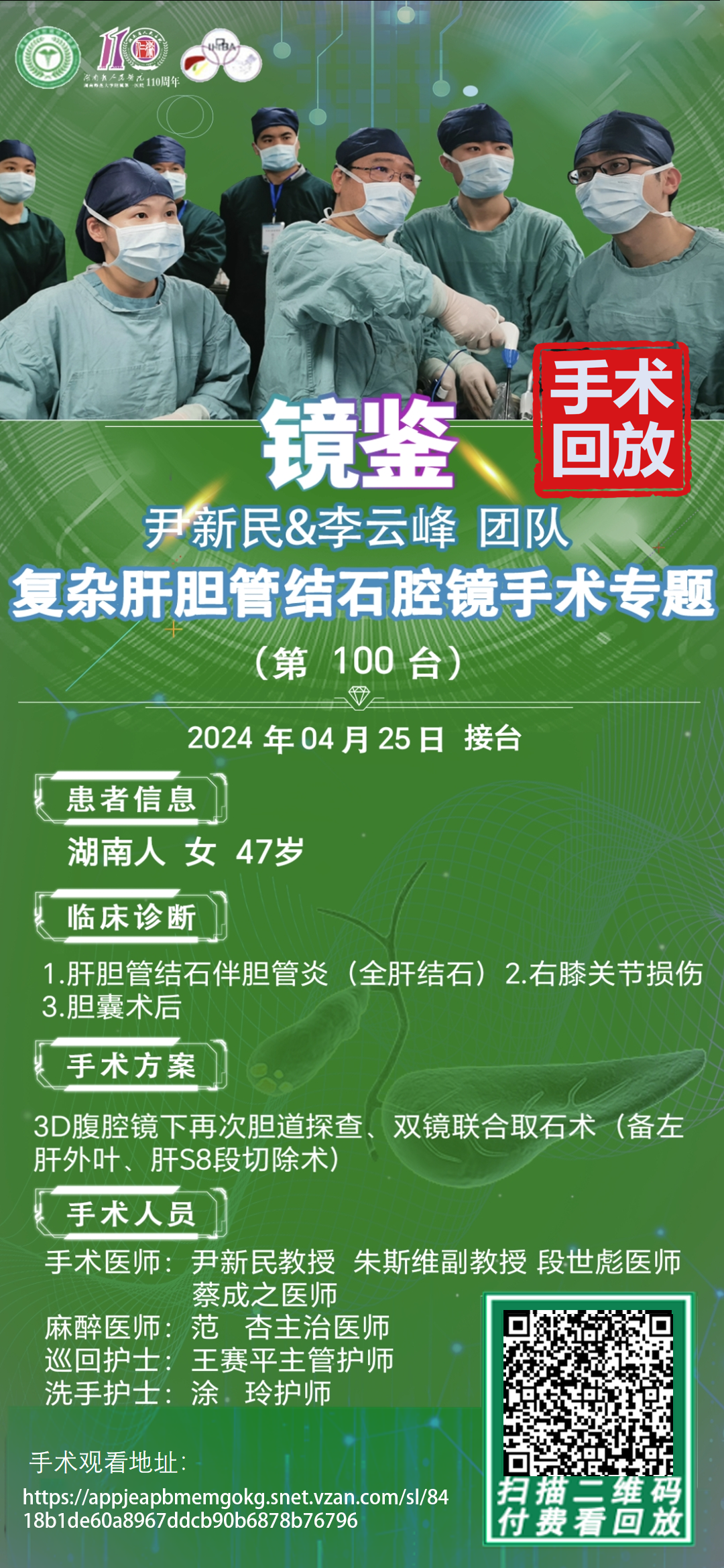 尹新民&李云峰团队四期结石腔镜手术第100台|3D腹腔镜下再次胆道探查、双镜联合取石术(备左肝外叶、肝S8段切除术)|1. 肝胆管结石伴胆管炎 (全肝结石)2.右膝关节损伤|20240425