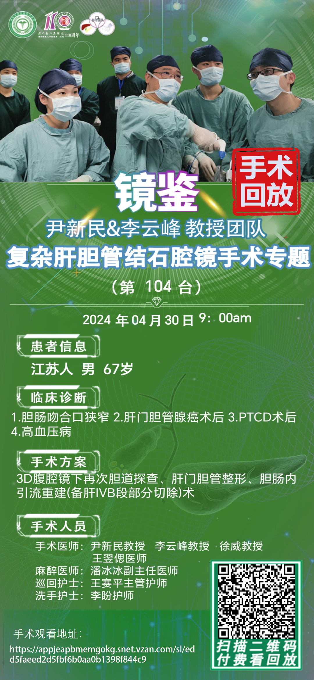 尹新民&李云峰团队四期结石腔镜手术第104台|3D腹腔镜下再次胆道探查、肝门胆管整形、胆肠内引流重建(备肝IVB段部分切除)术|1.胆肠吻合口狭窄 2.肝门胆管腺癌术后|20240430