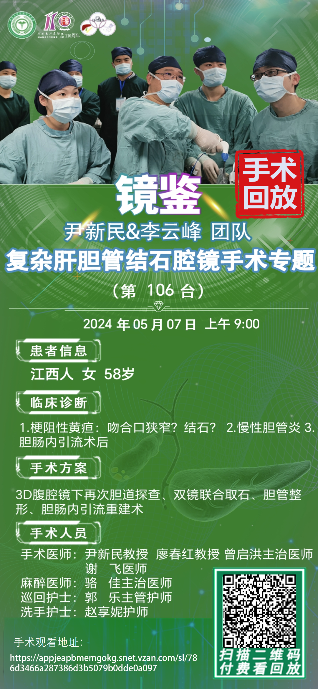 尹新民&李云峰团队四期结石腔镜手术第106台|3D腹腔镜下再次胆道探查、双镜联合取石、胆管整形、胆肠内引流重建术|1. 梗阻性黄疸:吻合口狭窄?结石? 2.开腹下胆肠内引流术后 |20240507