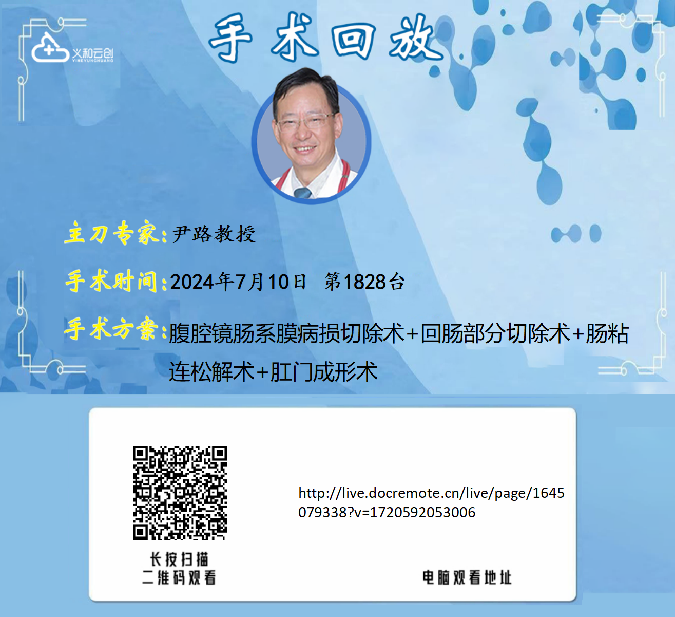 尹路教授团队第1828台|腹腔镜肠系膜病损切除术+回肠部分切除术+肠粘连松解术+肛门成形术|回肠造口状态 直肠吻合口狭窄 直肠恶性肿瘤个人史|20240710