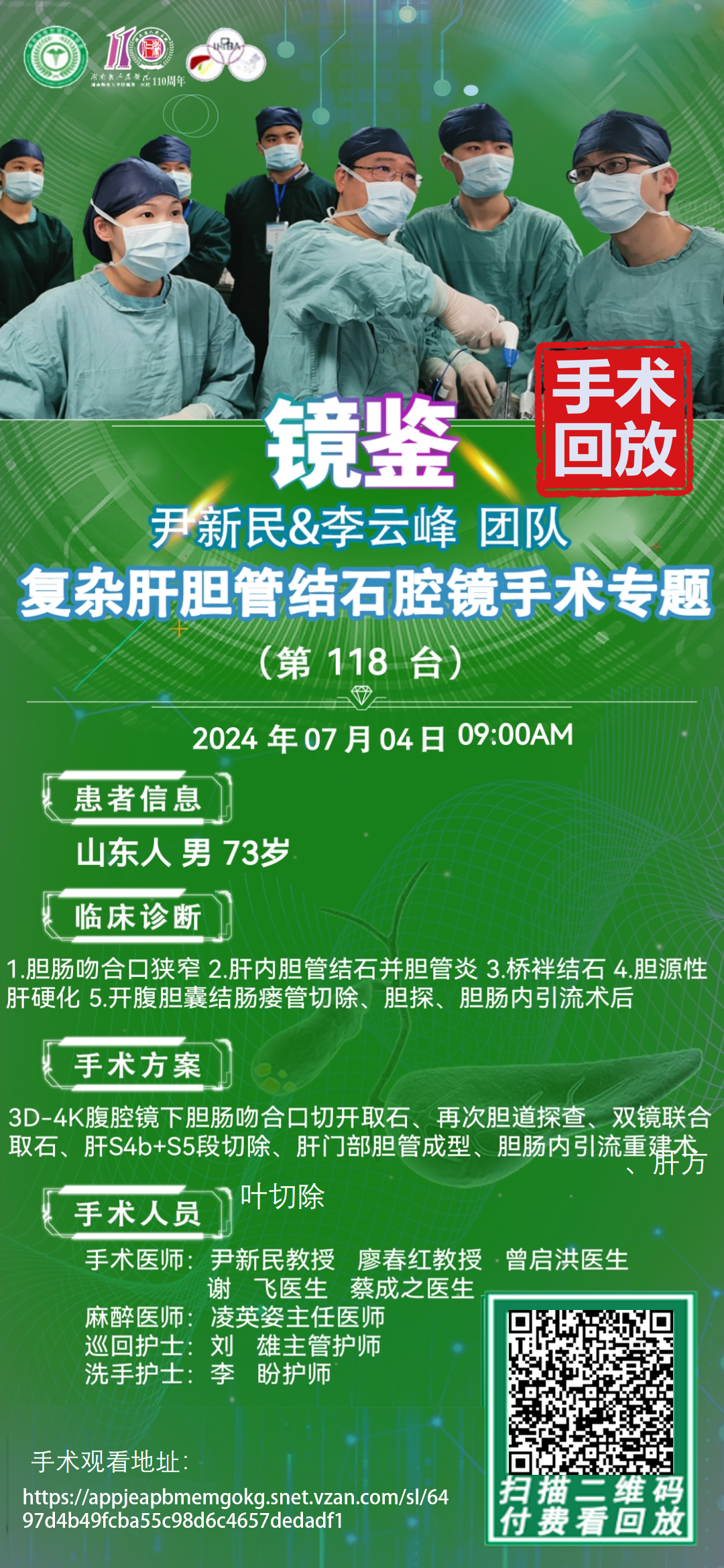 尹新民教授团队-复杂肝胆管结石腔镜手术-第118台|3D-4K荧光腹腔镜下胆肠吻合口切开取石、再次胆道探查、双镜联合取石、肝S4b+S5段切除、胆肠内引流重建术||20240704