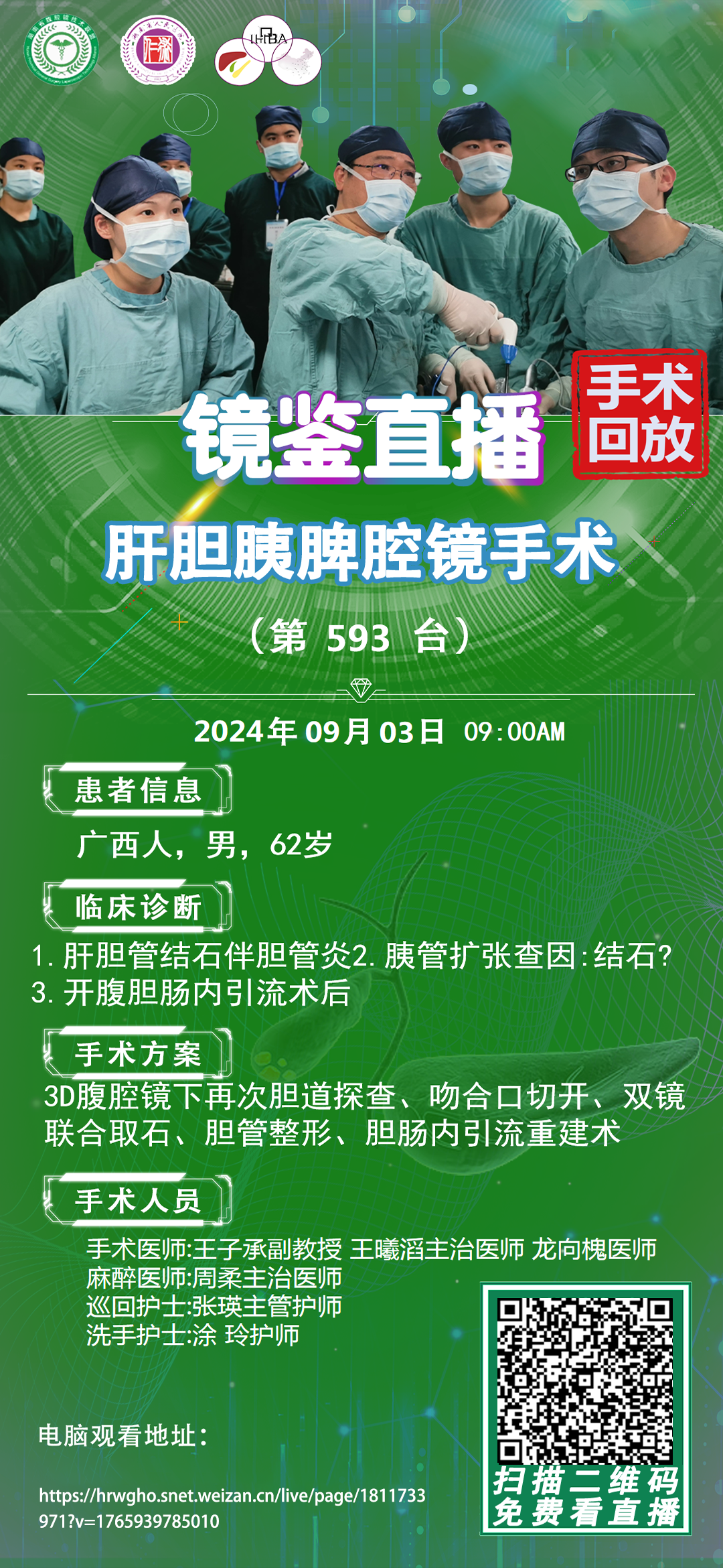 尹新民教授团队-镜鉴直播肝胆胰脾腔镜手术-第593台|1.肝胆管结石伴胆管炎 2.胰管扩张查因:结石?|3D腹腔镜下再次胆道探查、吻合口切开、双镜联合取石、胆管整形|20240903