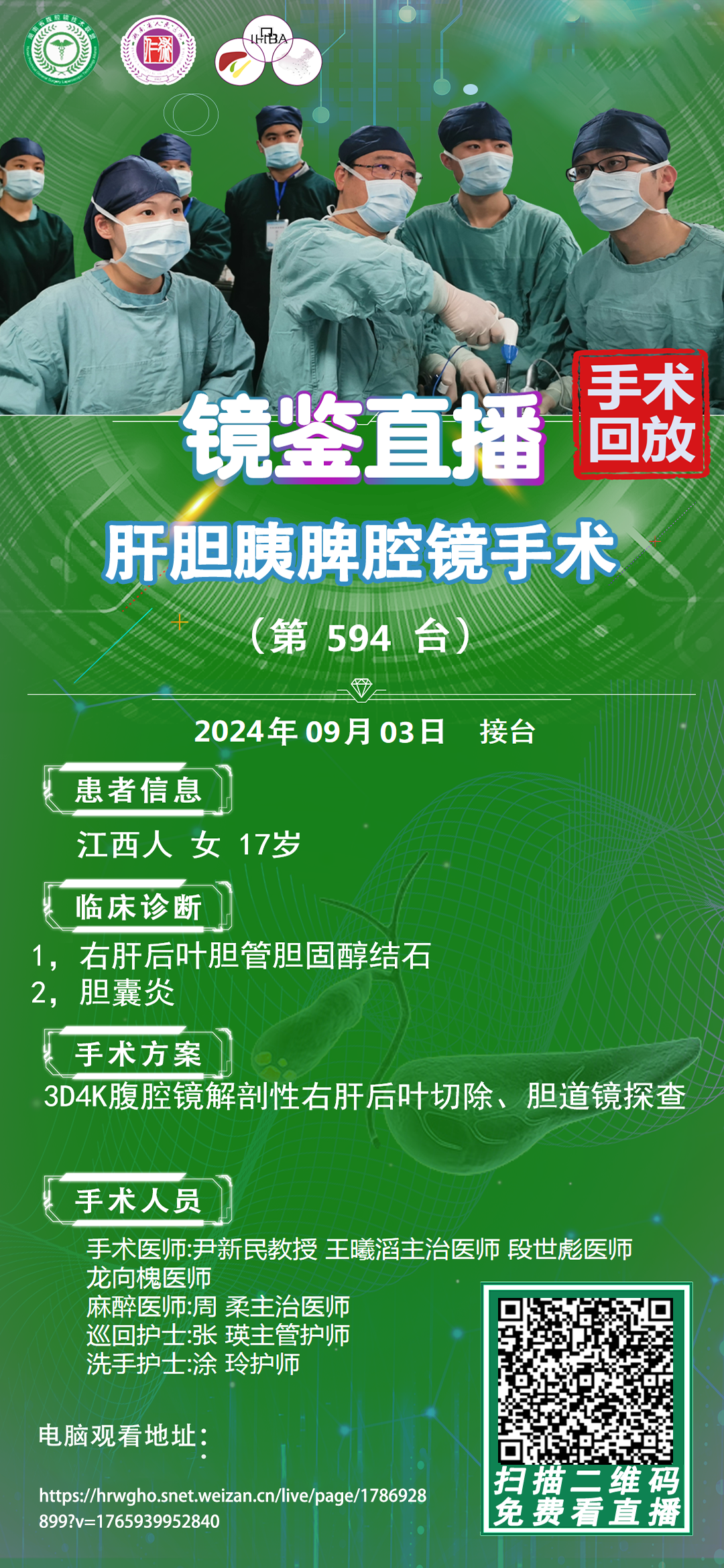 尹新民教授团队-镜鉴直播肝胆胰脾腔镜手术-第594台|1.右肝内胆管多发结石伴胆管扩张 2.胆汁淤积|3D4K腹腔镜下胆切胆探、右肝后叶切除术|20240903