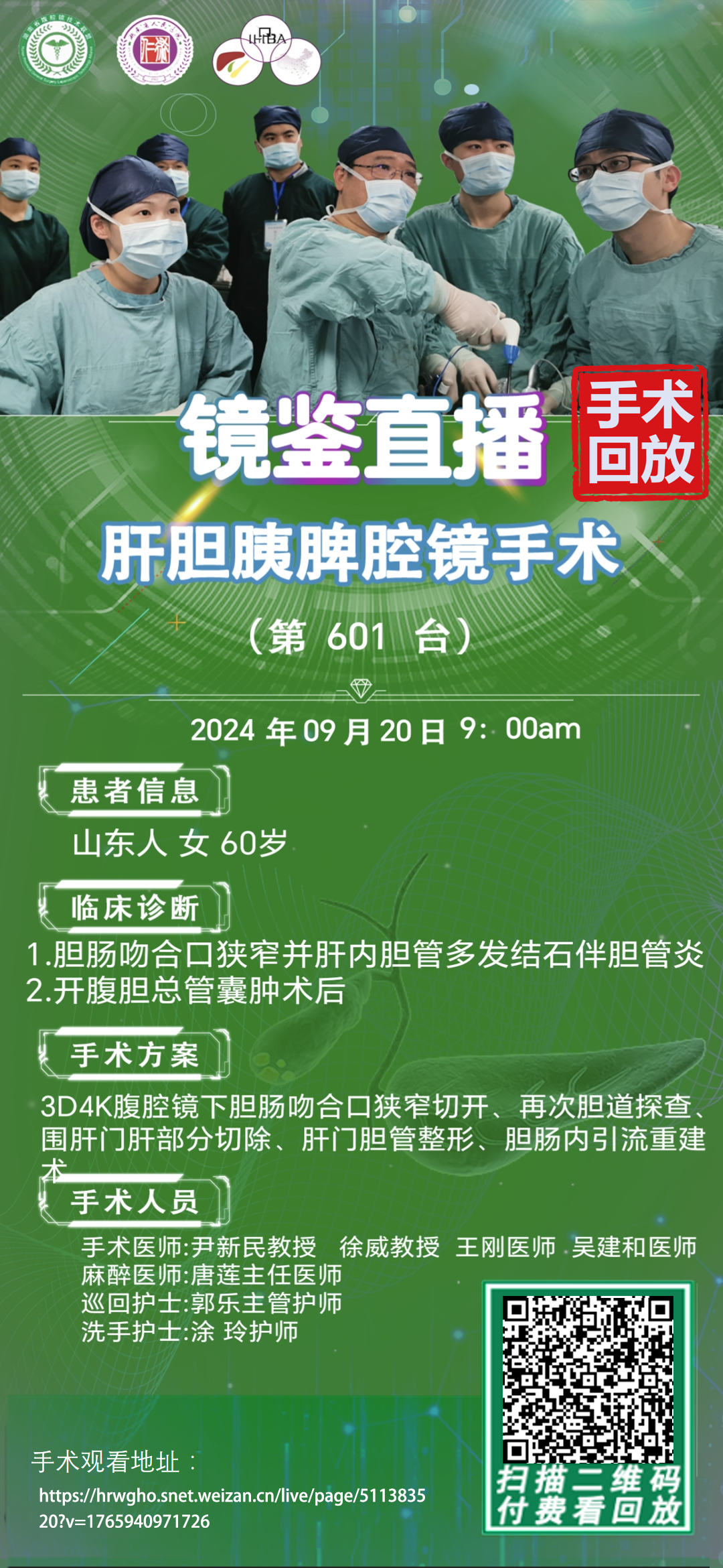 尹新民教授团队-镜鉴直播肝胆胰脾腔镜手术-第601台|1.胆肠吻合口狭窄并肝内胆管多发结石伴胆管炎2.开腹胆总管囊肿术后|3D4K腹腔镜下胆肠吻合口狭窄切开、再次胆道探查|20240920