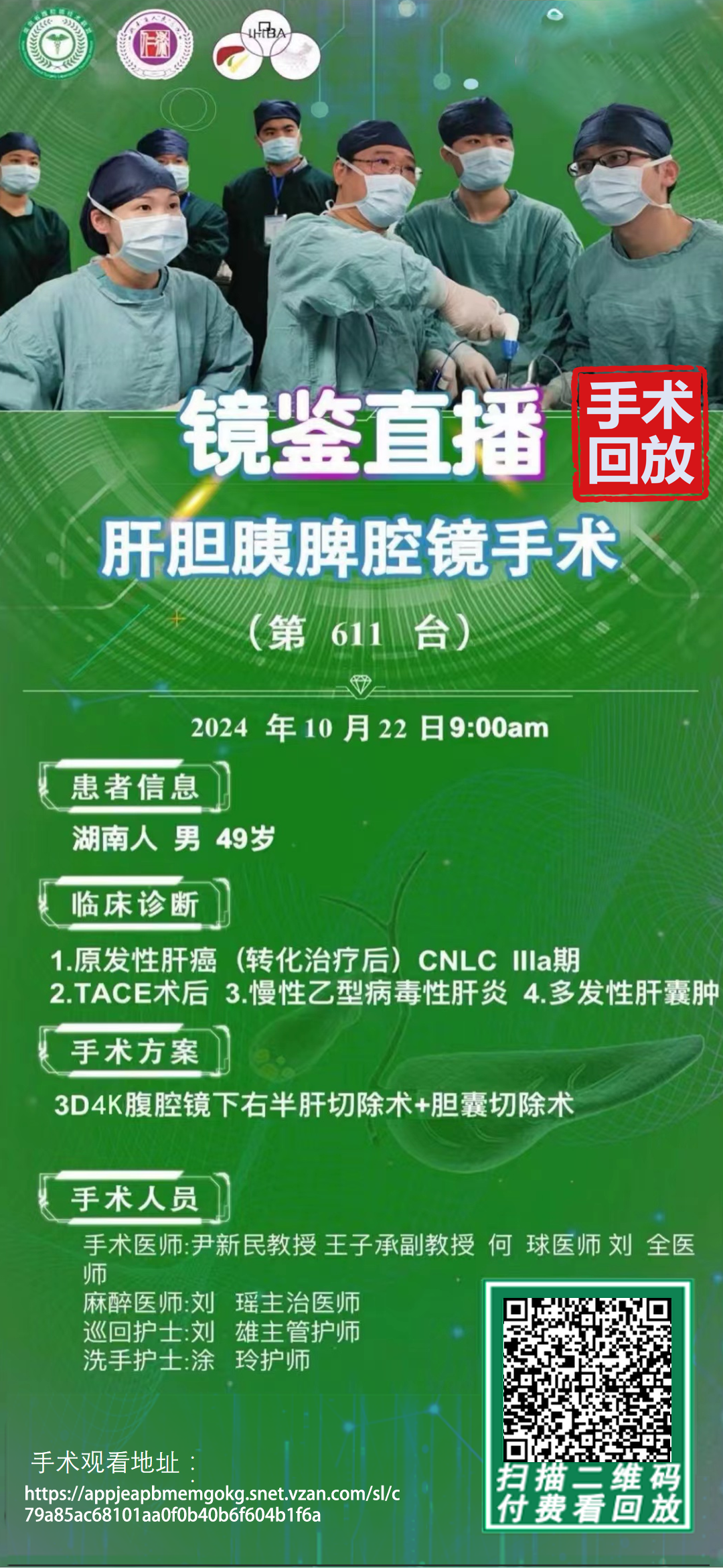 尹新民教授团队-镜鉴直播肝胆胰脾腔镜手术-第611台|3D4K腹腔镜下右半肝切除术+胆囊切除术|1.原发性肝癌(转化治疗后)CNLC Ila期2.TACE术后|20241022