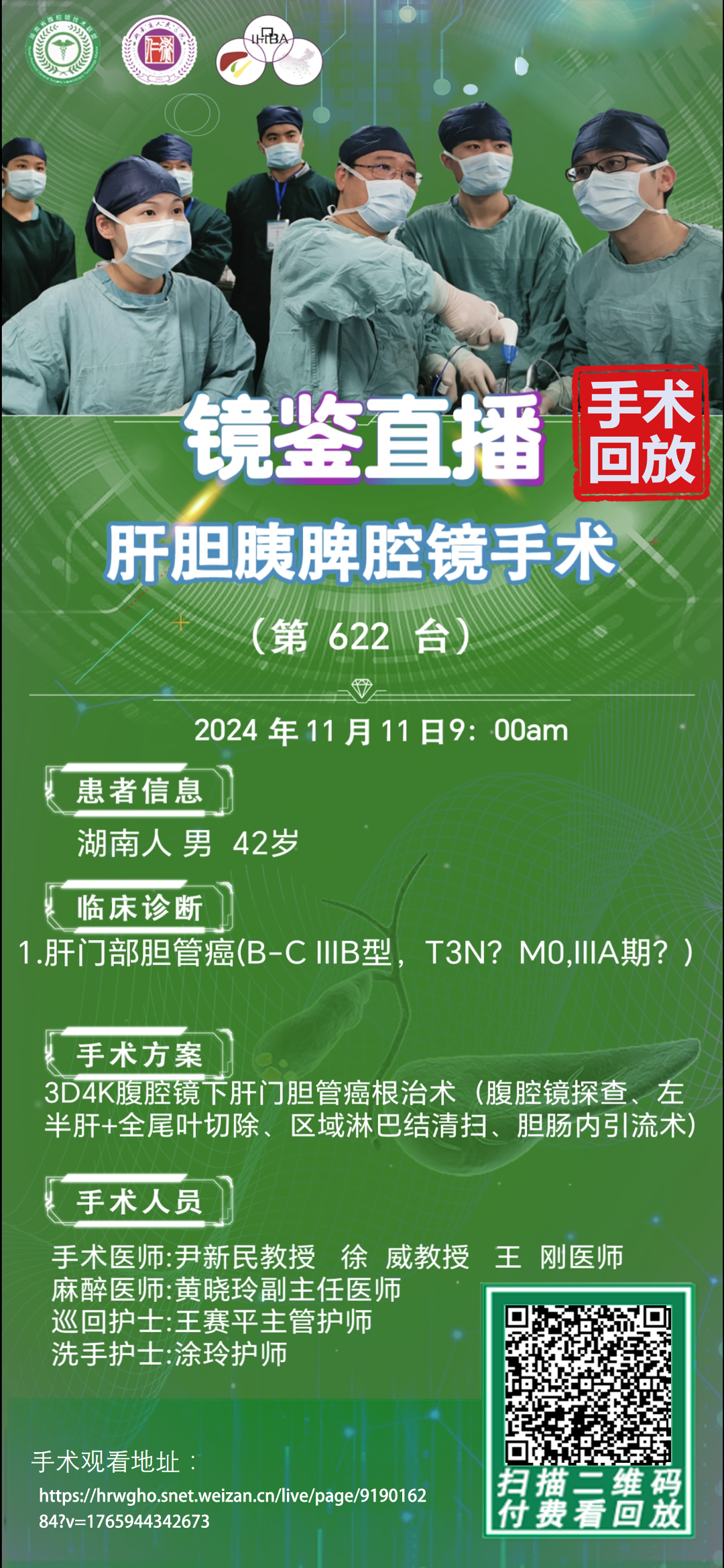 尹新民教授团队-镜鉴直播肝胆胰脾腔镜手术-第622台|3D4K腹腔镜下肝门胆管癌根治术(腹腔镜探查、左半肝+全尾叶切除、区域淋巴结清扫、胆肠内引流术)|1.肝门部胆管癌 |20241111