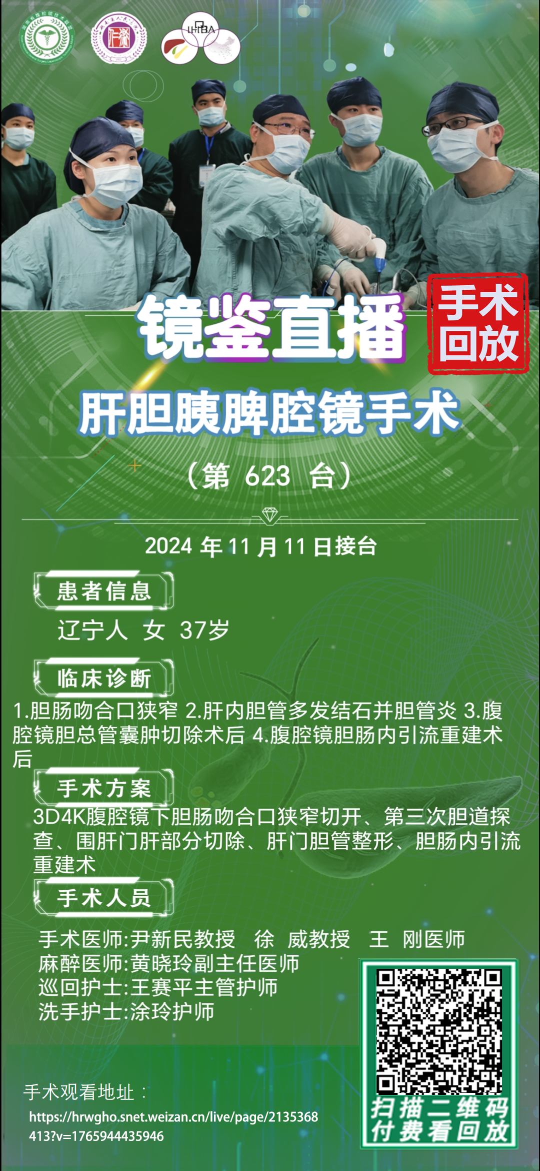 尹新民教授团队-镜鉴直播肝胆胰脾腔镜手术-第623台|3D4K腹腔镜下胆肠吻合口狭窄切开、第三次胆道探查、围肝门肝部分切除、肝门胆管整形、胆肠内引流重建|1.胆肠吻合口狭窄|20241111