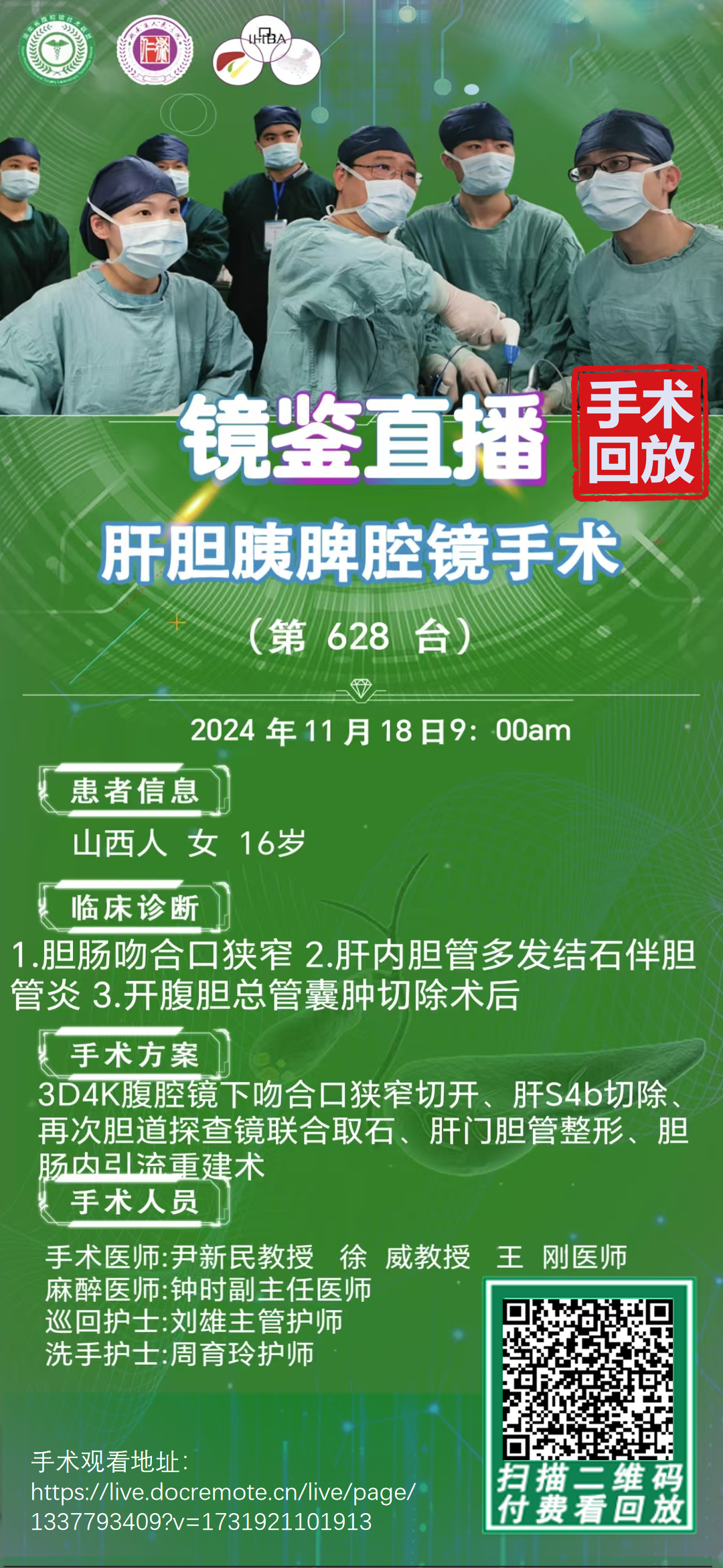 尹新民教授团队-镜鉴直播肝胆胰脾腔镜手术-第628台|3D4K腹腔镜下吻合口狭窄切开、肝S4b切除再次胆道探查镜联合取石、肝门胆管整形、胆肠内引流重建术|1.胆肠吻合口狭窄|20241118