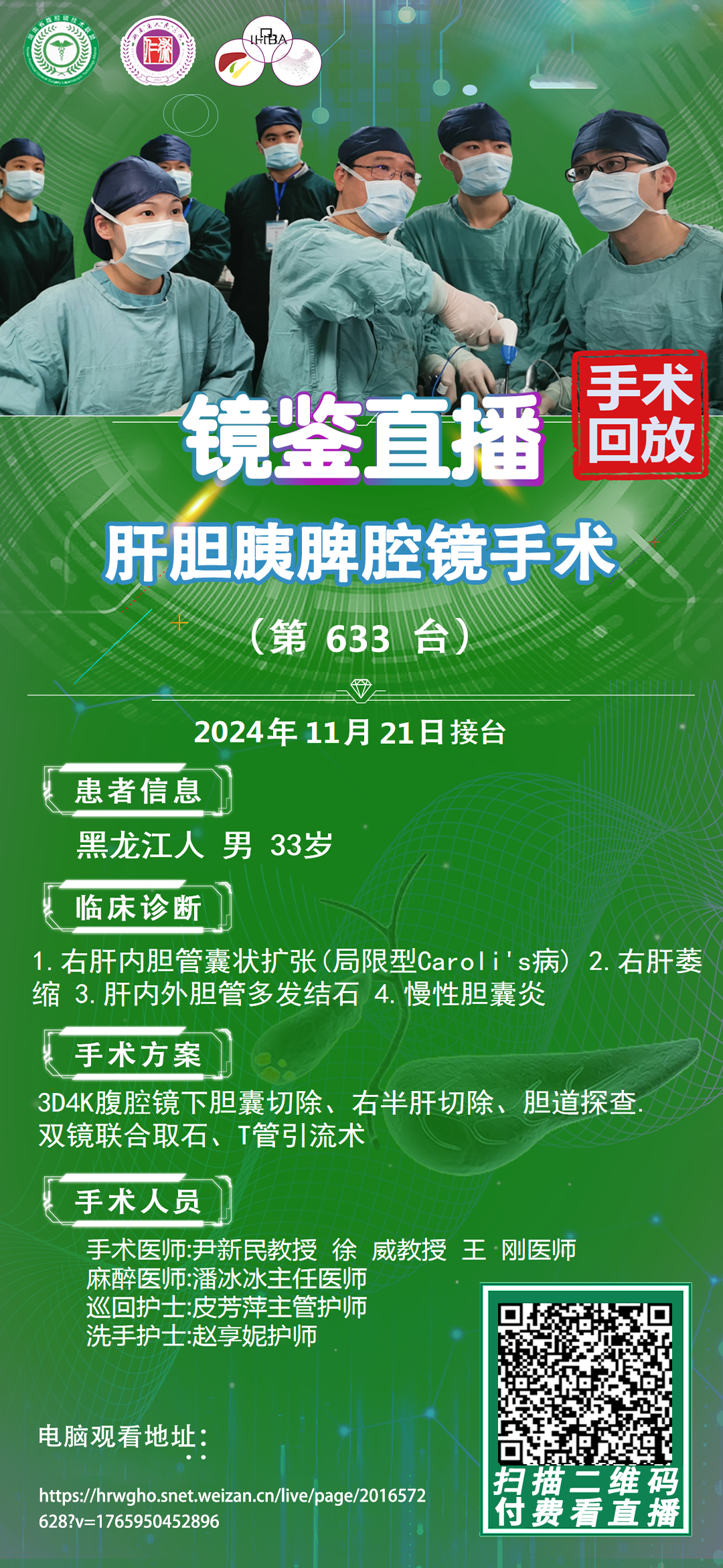尹新民教授团队-镜鉴直播肝胆胰脾腔镜手术-第633台|3D4K腹腔镜下胆囊切除、右半肝切除、胆道探查双镜联合取石、T管引流术|1.右肝内胆管囊状扩张(局限型Caroli's病)|20241121