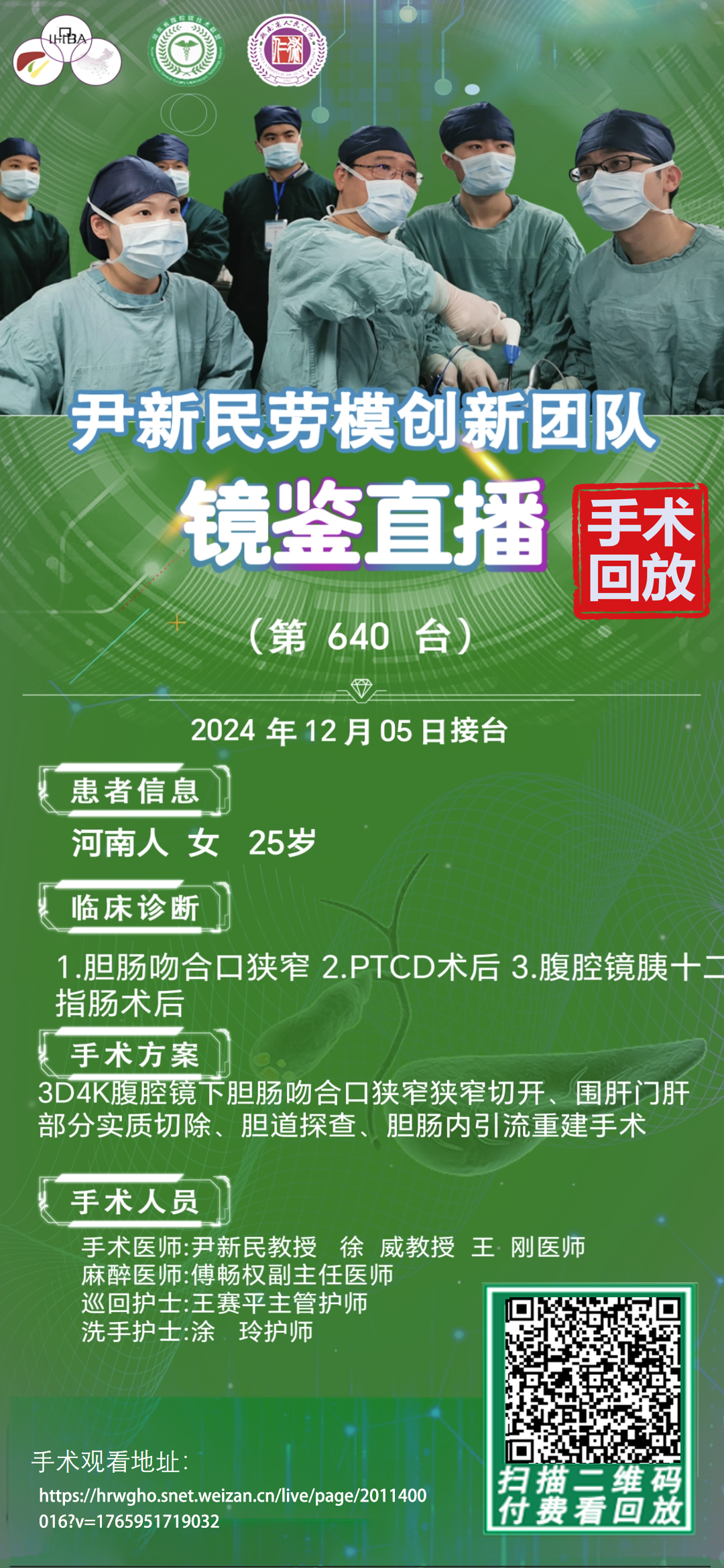 尹新民劳模创新团队镜鉴直播-第640台|3D4K腹腔镜下胆肠吻合口狭窄狭窄切开、围肝门肝部分实质切除、胆道探查、胆肠内引流重建手术|1.胆肠吻合口狭窄 2.PTCD术后 |20241205