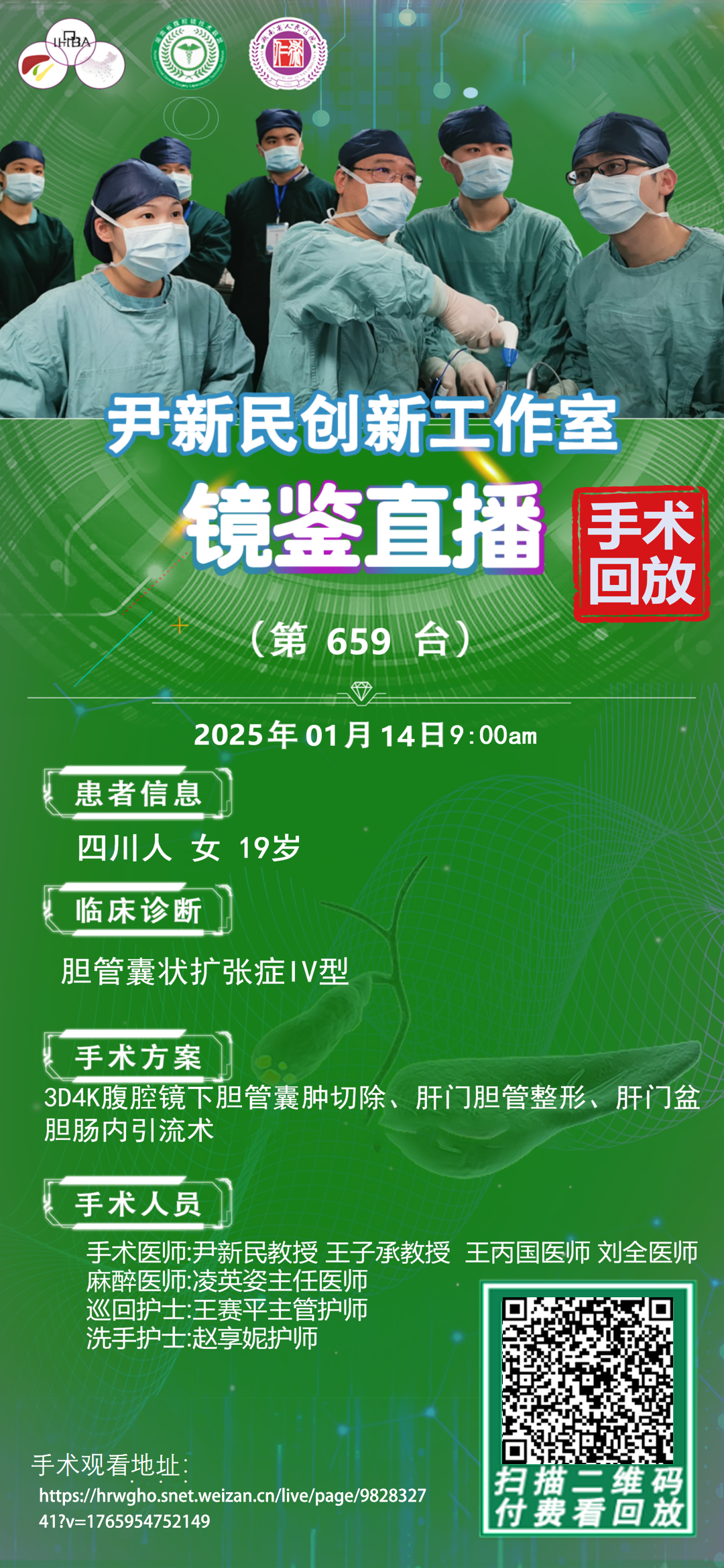尹新民劳模创新团队镜鉴直播-第659台|3D4K腹腔镜下胆管囊肿切除、肝门胆管整形、肝门盆胆肠内引流术、肝IVb段、部分肝V段切除术|胆管囊状扩张症IV型| 20250114