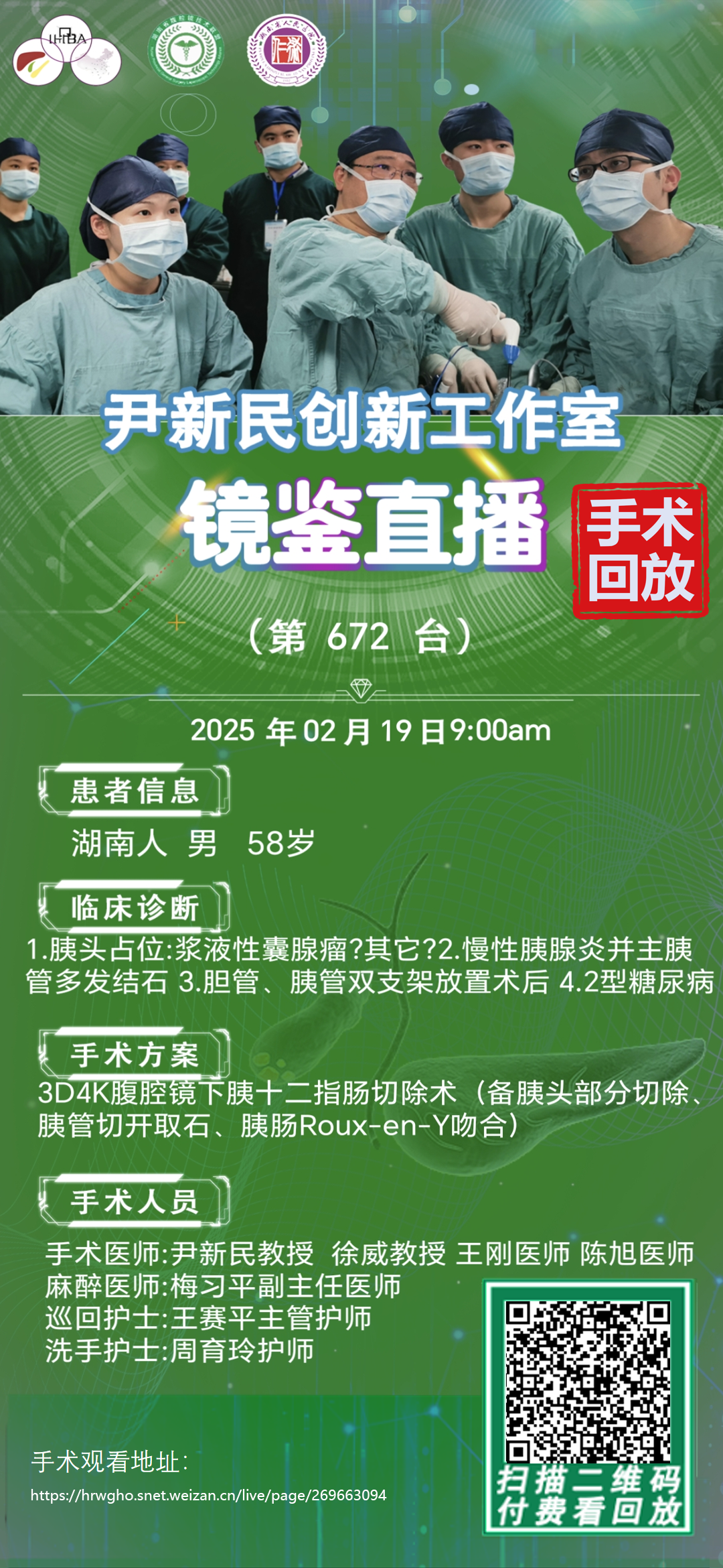 尹新民劳模创新团队镜鉴直播-第672台|3D4K腹腔镜下胰十二指肠切除术|1.胰头占位:浆液性囊腺瘤?其它?2.慢性胰腺炎并主胰 管多发结石 3.胆管、胰管双支架放置术后|20250219