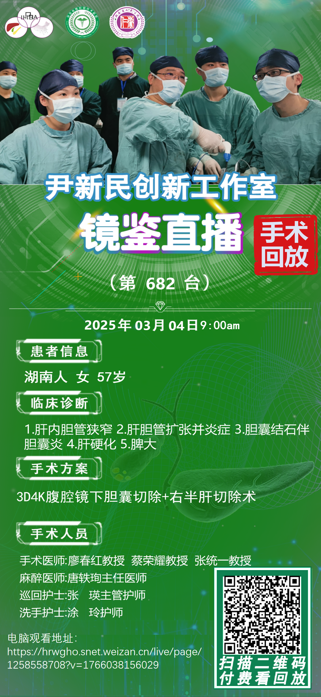尹新民劳模创新团队镜鉴直播-第681台|3D4K腹腔镜胆囊切除+右半肝切除术|1.肝内胆管狭窄 2.肝胆管扩张并炎症 3.胆囊结石伴胆囊炎 4.肝硬化 5.脾大|20250304