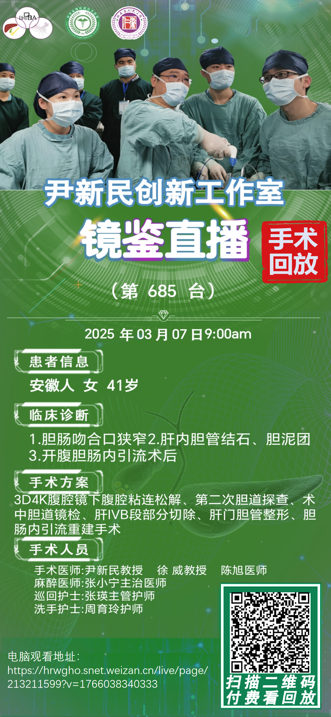 尹新民劳模创新团队镜鉴直播-第685台|3D4K腹腔镜下3D4K腹腔镜下腹腔粘连松解、第二次胆道探查、术中胆道镜检、肝IVB段部分切除|1.胆肠吻合口狭窄2.肝内胆管结石、胆泥团|20250307