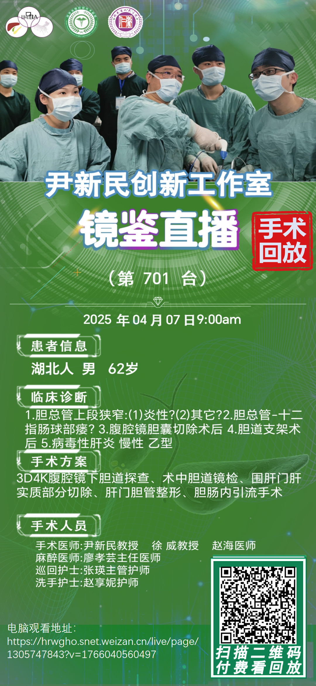 尹新民劳模创新团队镜鉴直播-第701台|3D4K腹腔镜下腹腔粘连松解、胆道探查、术中胆道镜检、围肝门肝实质部分切除、肝门胆管整形、胆肠内引流手术|1.胆总管上段狭窄:(1)炎性|20250407