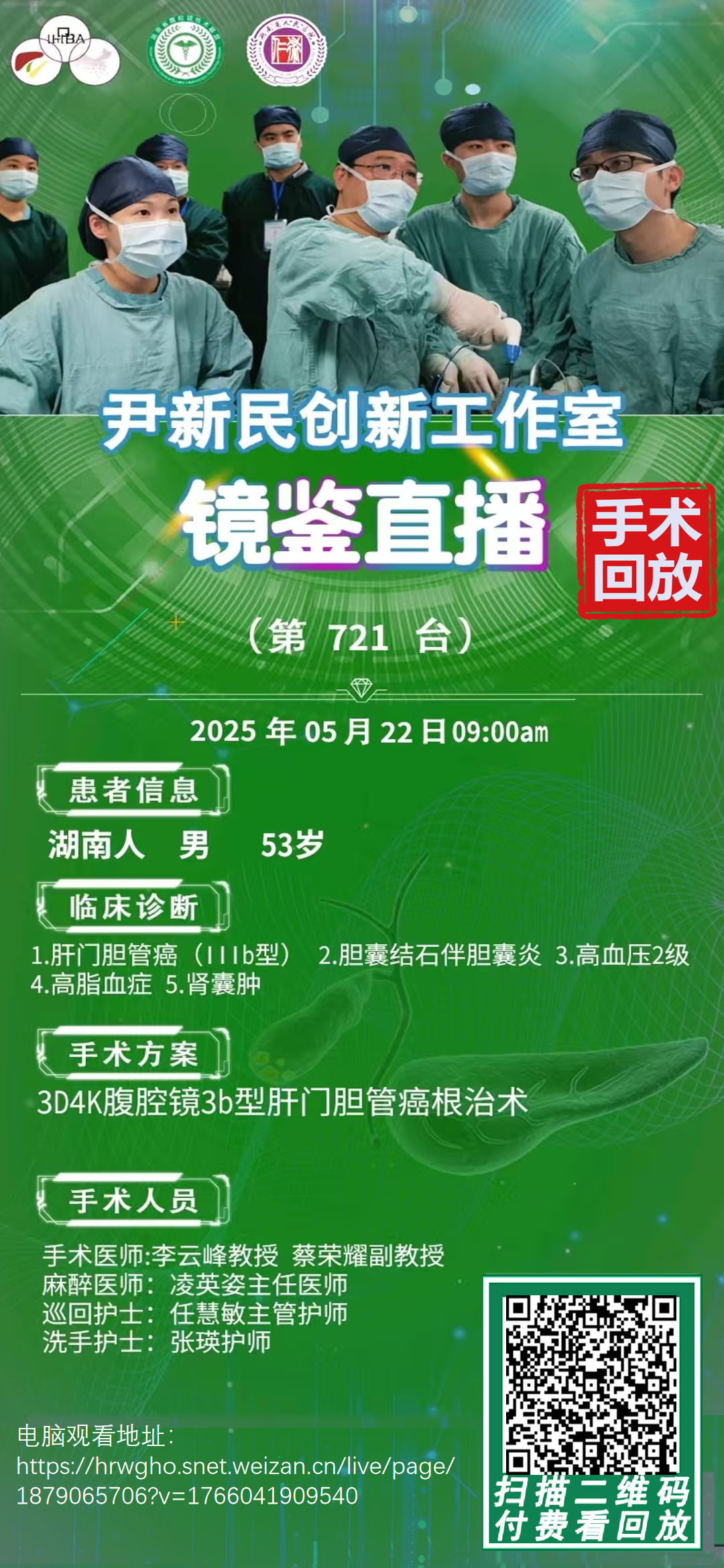 尹新民劳模创新团队镜鉴直播-第721台|腹腔镜3b型肝门胆管癌根治术|1.肝门胆管癌(IIIb型) 2.胆囊结石伴胆囊炎 3.高血压2级 4.高脂血症 5.肾囊肿。|20250522