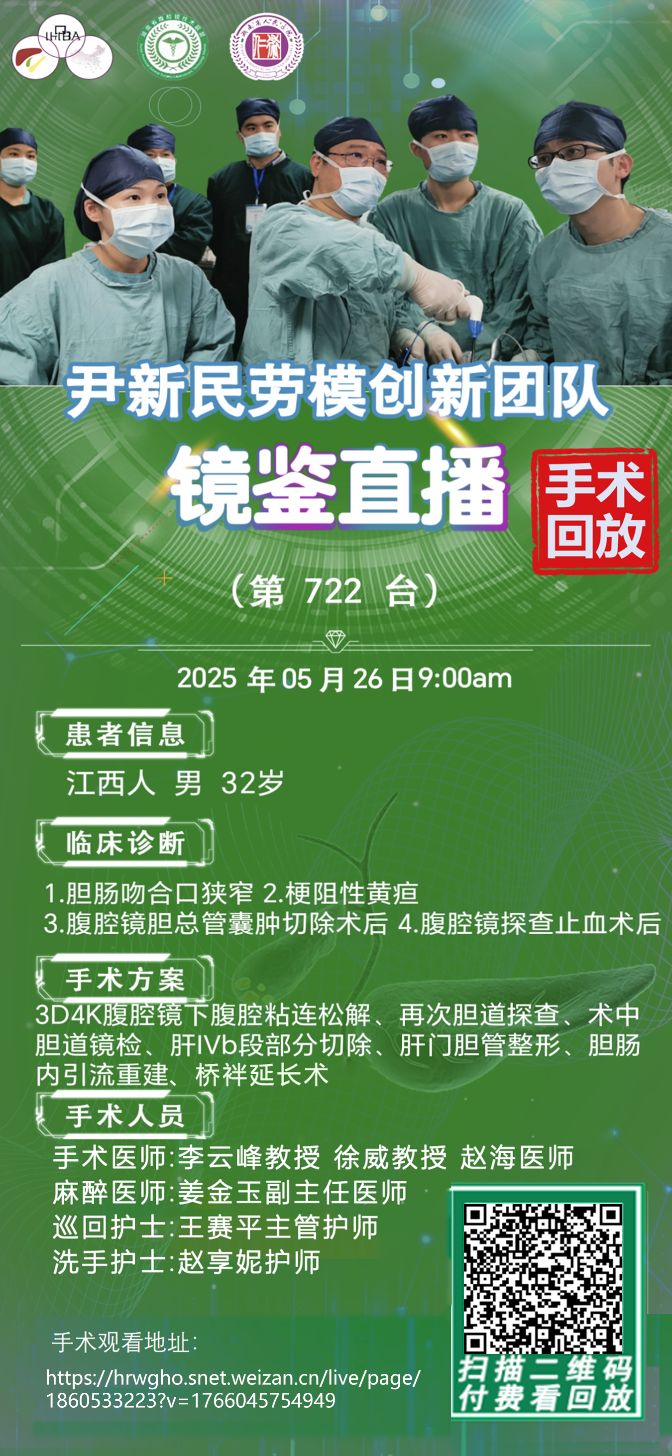 尹新民劳模创新团队镜鉴直播-第723台|3D4K腹腔镜下再次胆道探查、肝门胆管成型、胆肠内引流重建、备肝部分切除|肝内胆管结石伴胆管炎|20250528