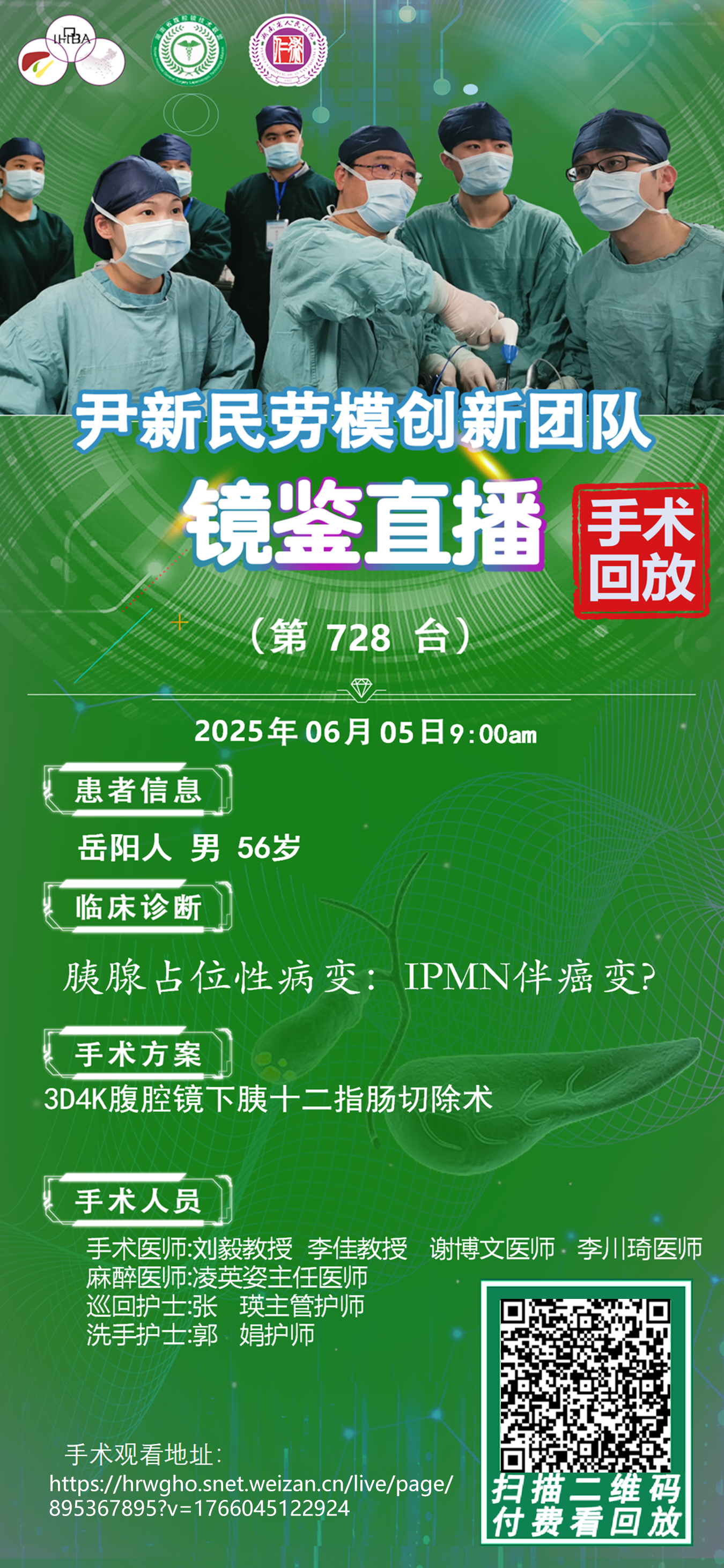尹新民劳模创新团队镜鉴直播-第728台|3D4K腹腔镜下胰十二指肠切除术|1. 胰腺占位性病变:IPMN伴癌变?2.肝功能不全3.高血压病1级4.肝囊肿5.肾囊肿?6.肾结石|20250605
