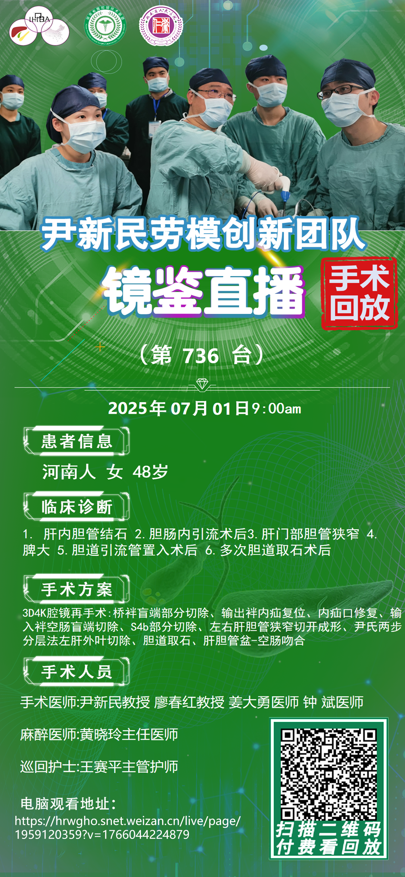 尹新民劳模创新团队镜鉴直播-第736台|3D4K腹腔镜下再次胆道探查、胆道取石、肝ⅣB段部分切除、肝门胆管整形、桥袢延长、胆肠内引流重建术|肝内胆管结石|20250701