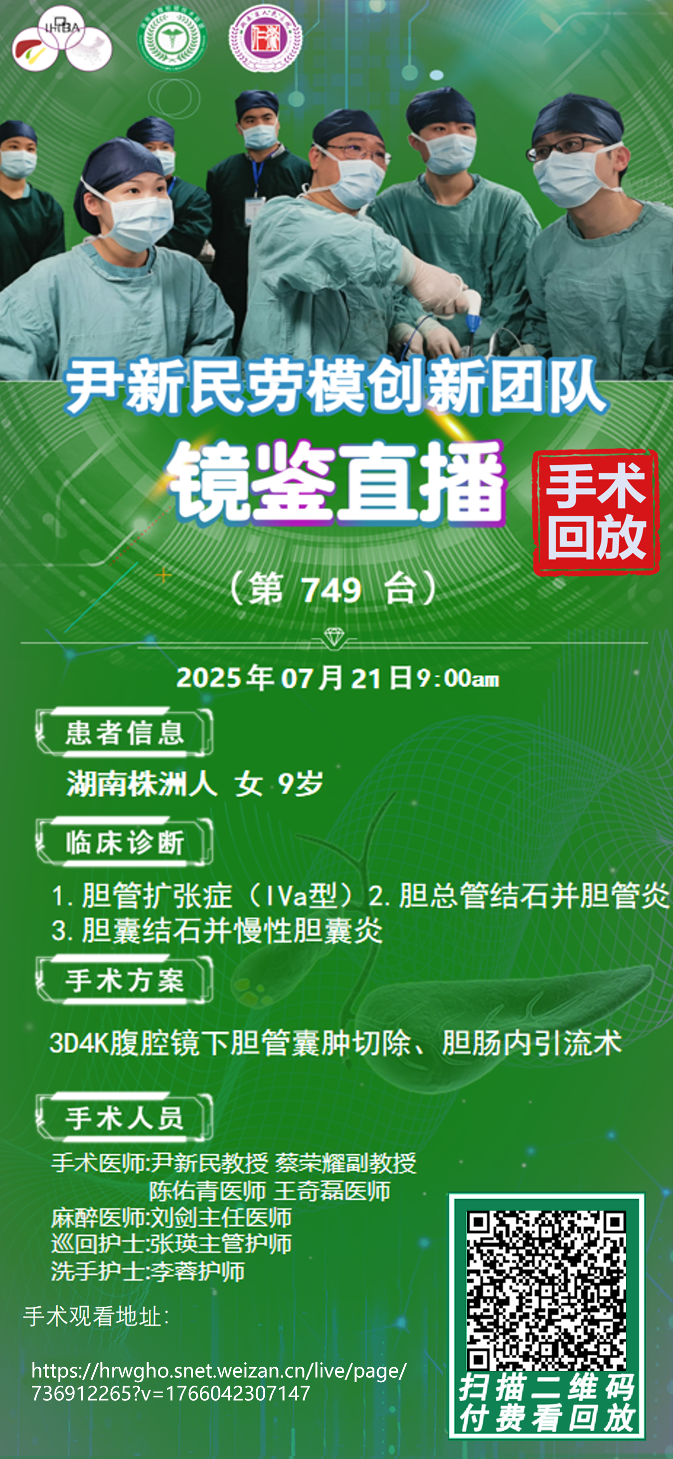 尹新民劳模创新团队镜鉴直播-第749台|3D4K腹腔镜下胆管囊肿切除、胆肠内引流术|1.胆管扩张症(IVa型)2.胆总管结石并胆管炎 3.胆囊结石并慢性胆囊炎|20250721