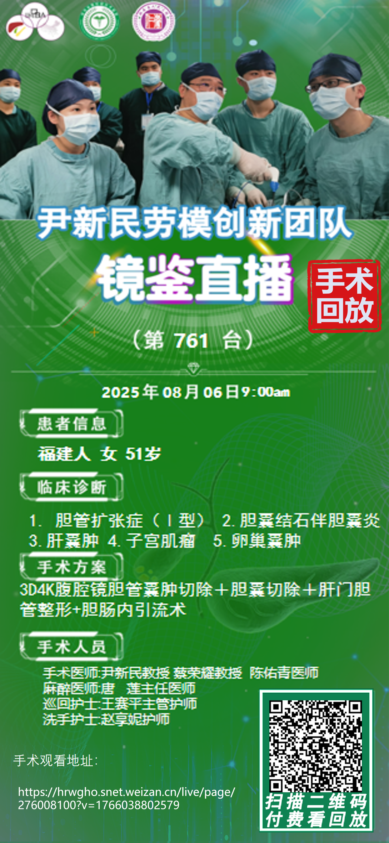 尹新民劳模创新团队镜鉴直播-第761台|3D4K腹腔镜胆管囊肿切除+胆囊切除+肝门胆管整形+胆肠内引流术|1. 胆管扩张症(Ⅰ型) 2.胆囊结石伴胆囊炎 3.肝囊肿 4.子宫肌瘤|20250806