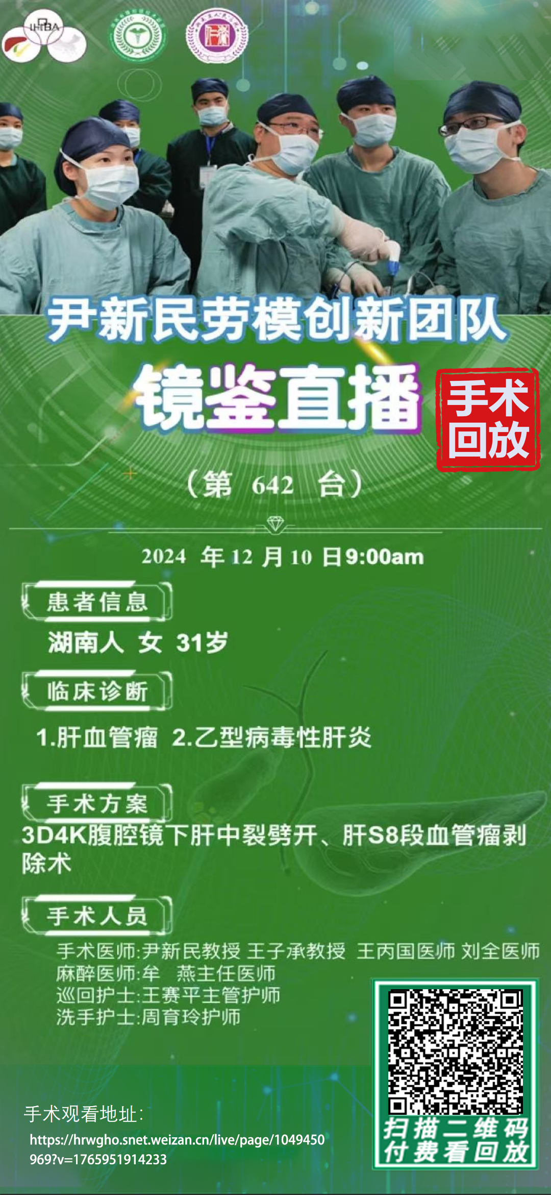 尹新民劳模创新团队镜鉴直播-第642台|3D4K腹腔镜下肝中裂劈开、肝S8段血管瘤剥 除术|1.肝血管瘤 2.乙型病毒性肝炎|20241210
