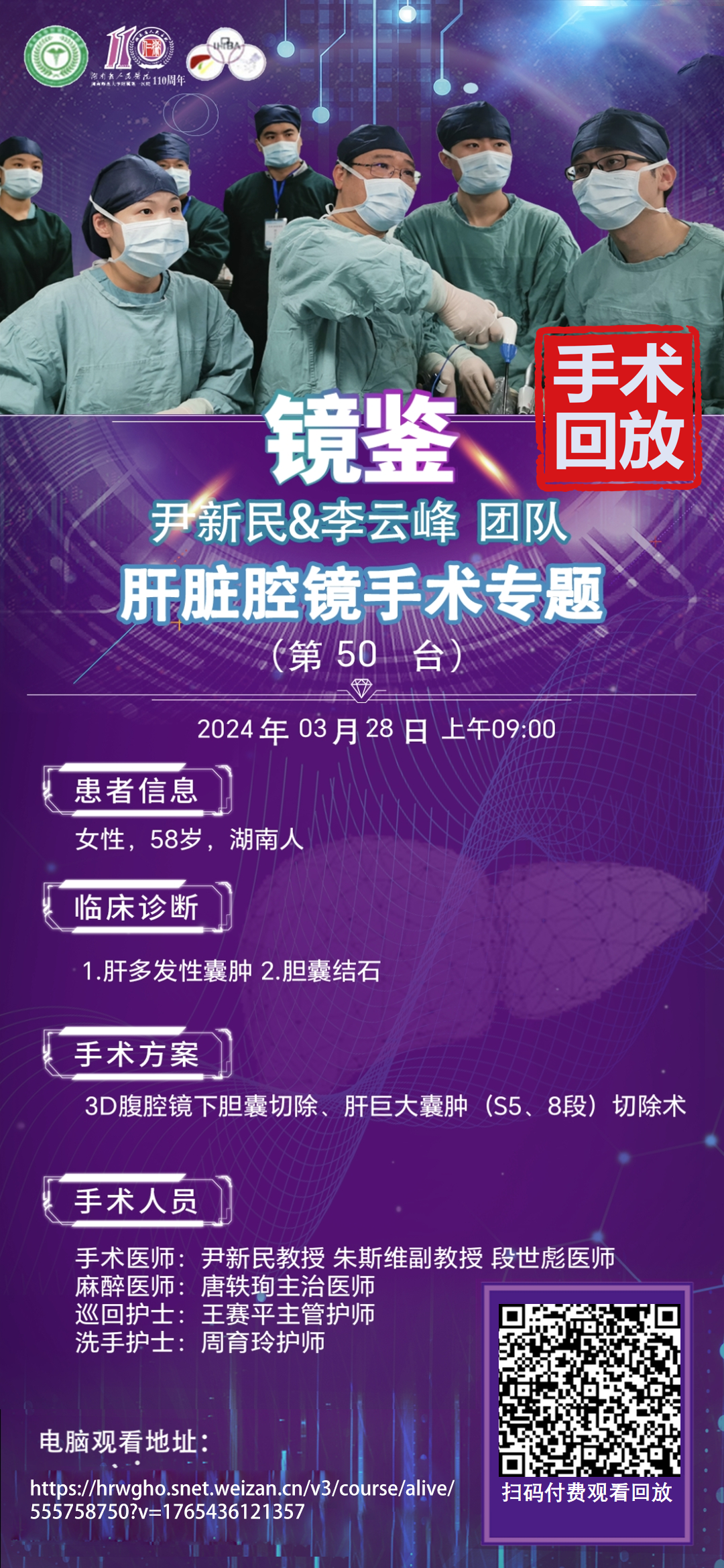 尹新民&李云峰团队|四期肝脏腔镜手术|第50台|3D腹腔镜下胆囊切除、肝巨大囊肿 (S5、8段) 切除术|1.肝多发性囊肿 2.胆囊结石|20240328