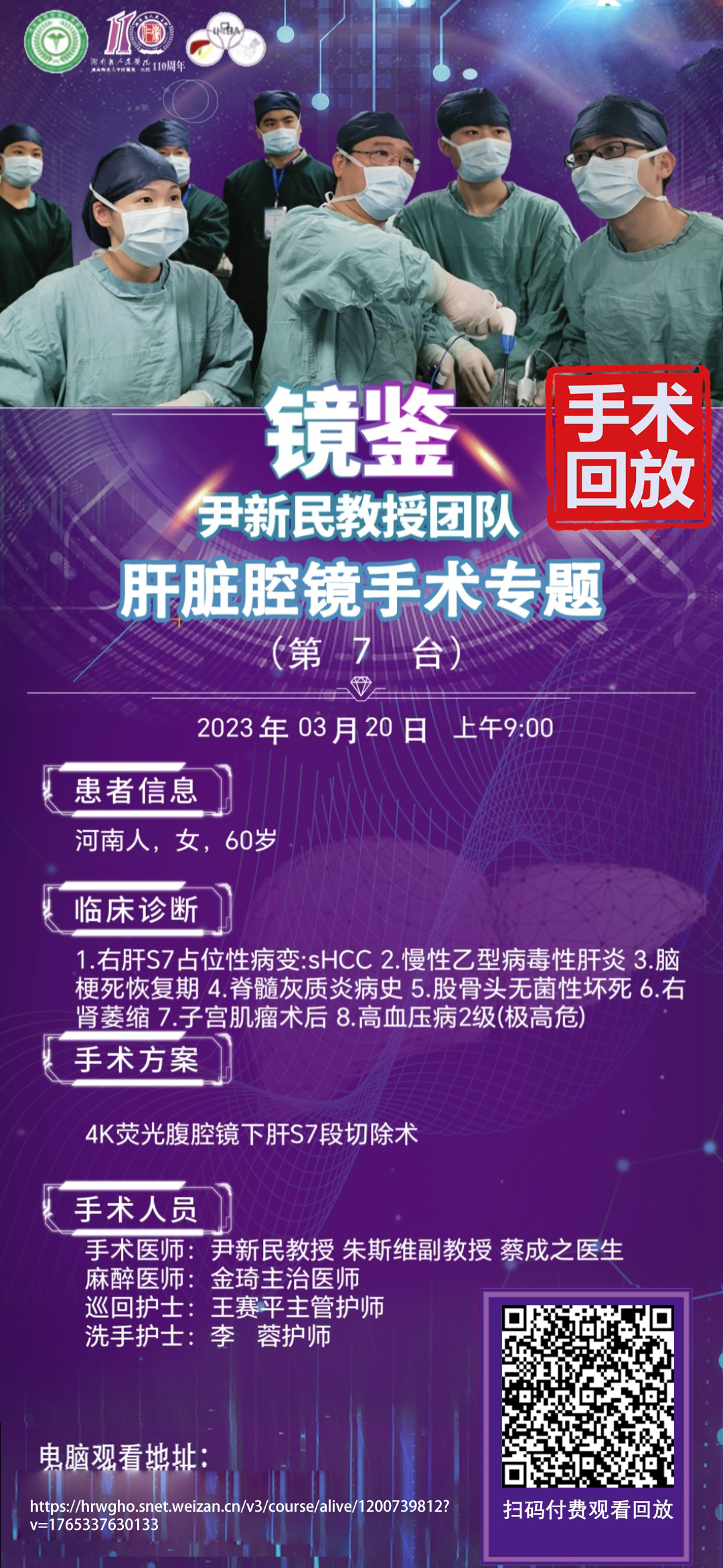 尹新民教授团队肝脏腔镜第7台|4K荧光腹腔镜下肝S7段切除术|1.右肝S7占位性病变:sHCC 2.慢性乙型病毒性肝炎3.脑 梗死恢复期 4.脊髓灰质炎病史5.股骨头无菌性坏死|20230320