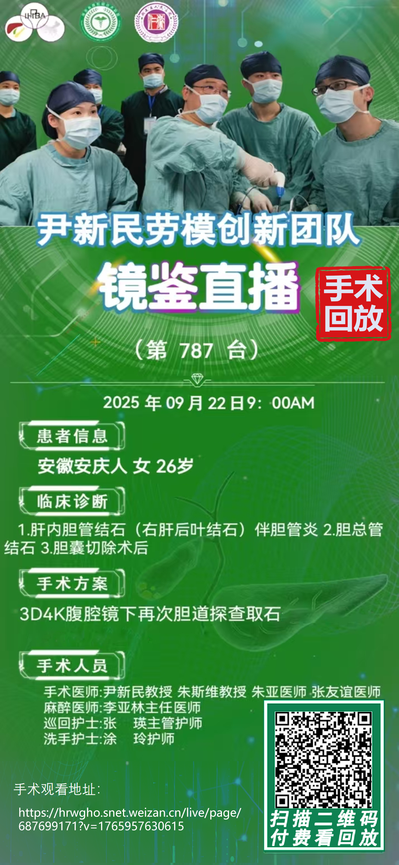 尹新民劳模创新团队镜鉴直播-第787台|3D4K腹腔镜下再次胆道探查取石备右肝后叶(S6段)切除术|1.肝内胆管结石(右肝后叶结石)伴胆管炎 2.胆总管结石 3.胆囊切除术后|20250922