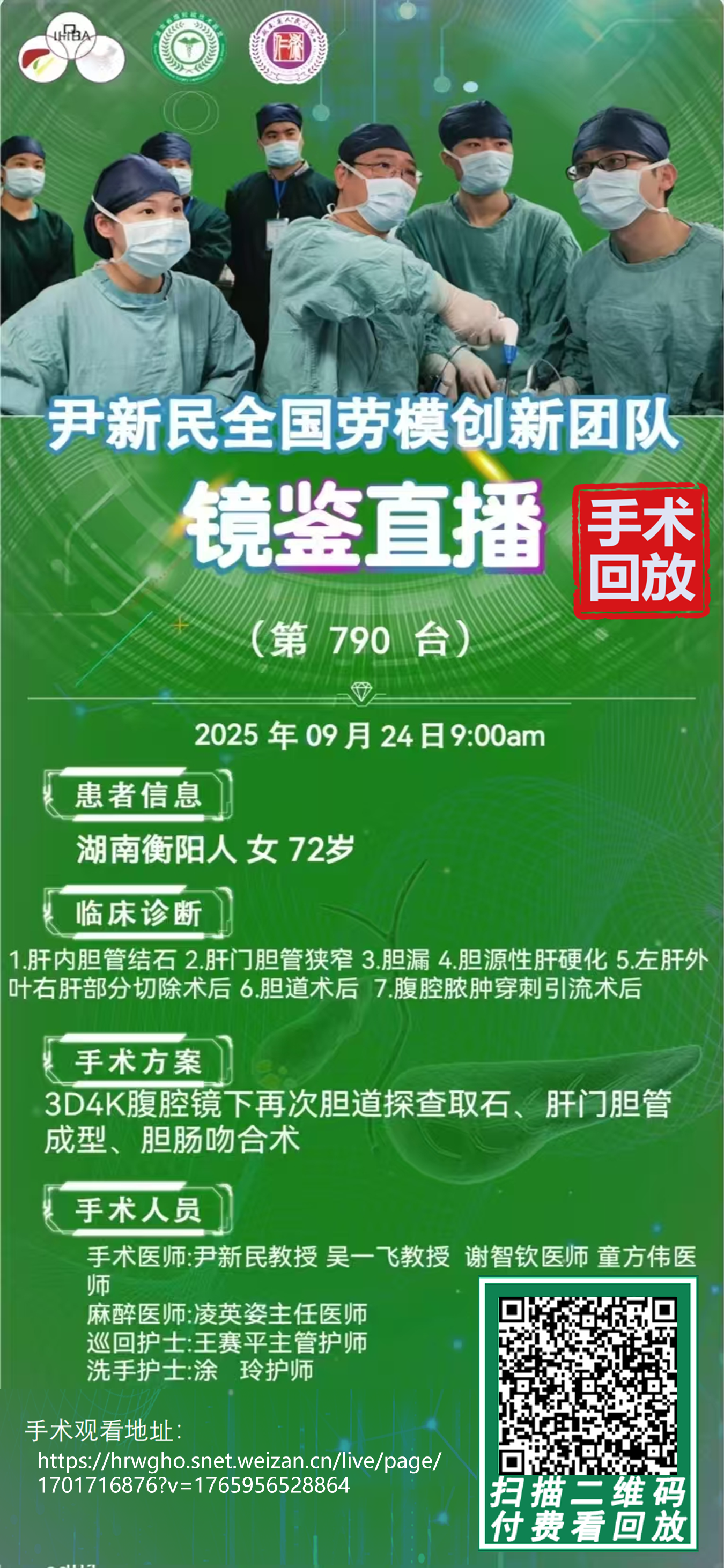 尹新民劳模创新团队镜鉴直播-第790台|3D4K腹腔镜下再次胆道探查取石、肝门胆管成型、胆肠吻合手术|1.肝内胆管结石 2.肝门胆管狭窄 3.胆漏 4.胆源性肝硬化 |20250924