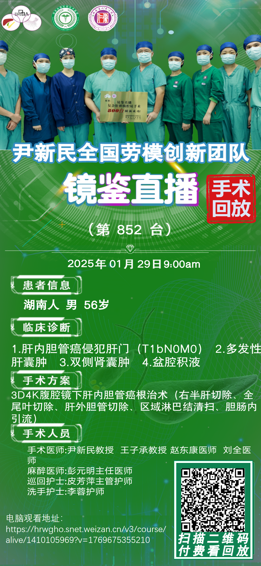 尹新民劳模创新团队镜鉴直播-第852台|3D4K腹腔镜下肝内胆管癌根治术(右半肝切除、全尾叶切除、肝外胆管切除、区域淋巴结清扫、胆肠内 引流)||20260129
