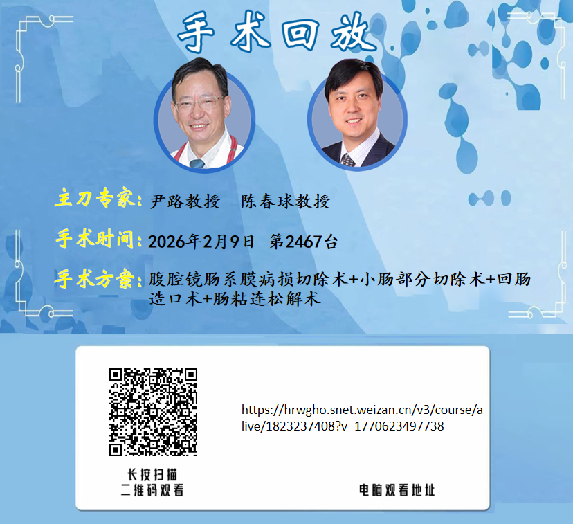 尹路教授团队第2467台 | 腹腔镜肠系膜病损切除术+小肠部分切除术+回肠造口术+肠粘连松解术 | 小肠梗阻 放射性肠炎(缺血性肠炎) 腹腔粘连 直肠恶性肿瘤个人史|20260209