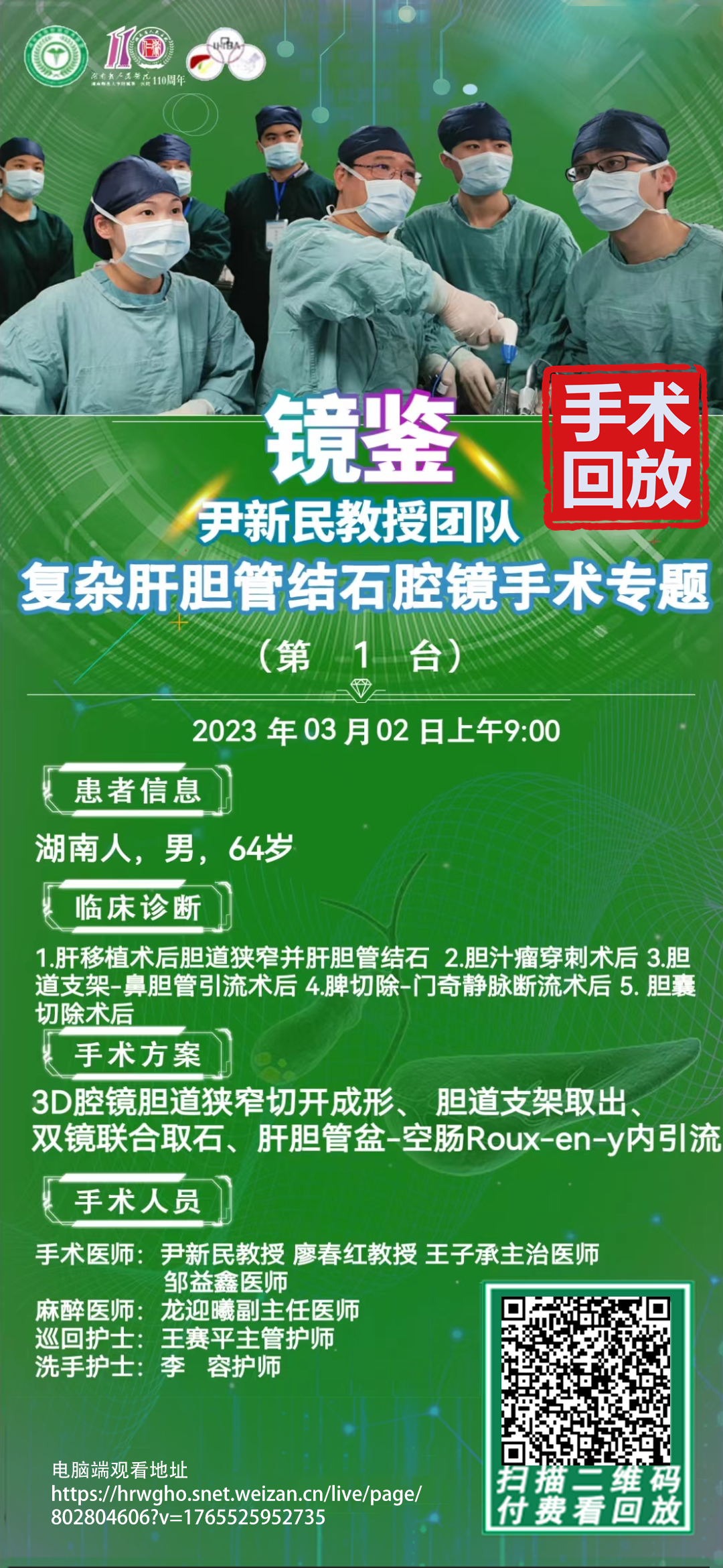 尹新民教授团队第2台|3D腹腔镜下第五次胆道探查、围肝门切除、肝门胆管成型、胆道镜取石、胆肠内引流重建术|20230313
