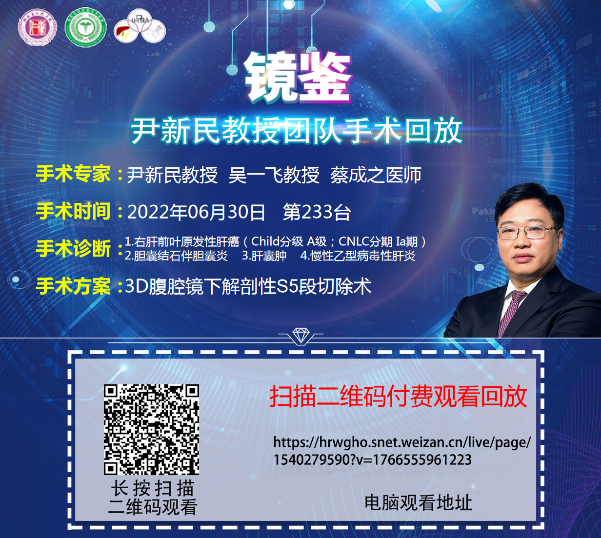 尹新民教授团队233台|3D腹腔镜肝S5S8段切除术|"1.右肝前叶原发性肝癌(Child分级 A级;CNLC分期 Ia期) 2.胆囊结石伴胆囊炎 3.肝囊肿|20220630