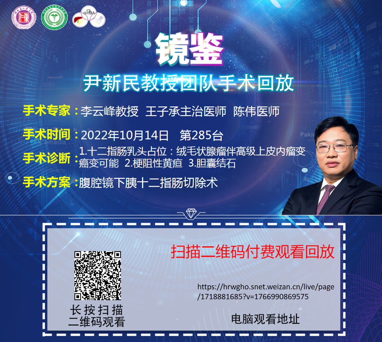 尹新民教授团队第285台 | 腹腔镜下胰十二指肠切除术 |1.十二指肠乳头占位:绒毛状腺瘤伴高级上皮内瘤变癌变可能 2.梗阻性黄疸 3.胆囊结石 |20221014