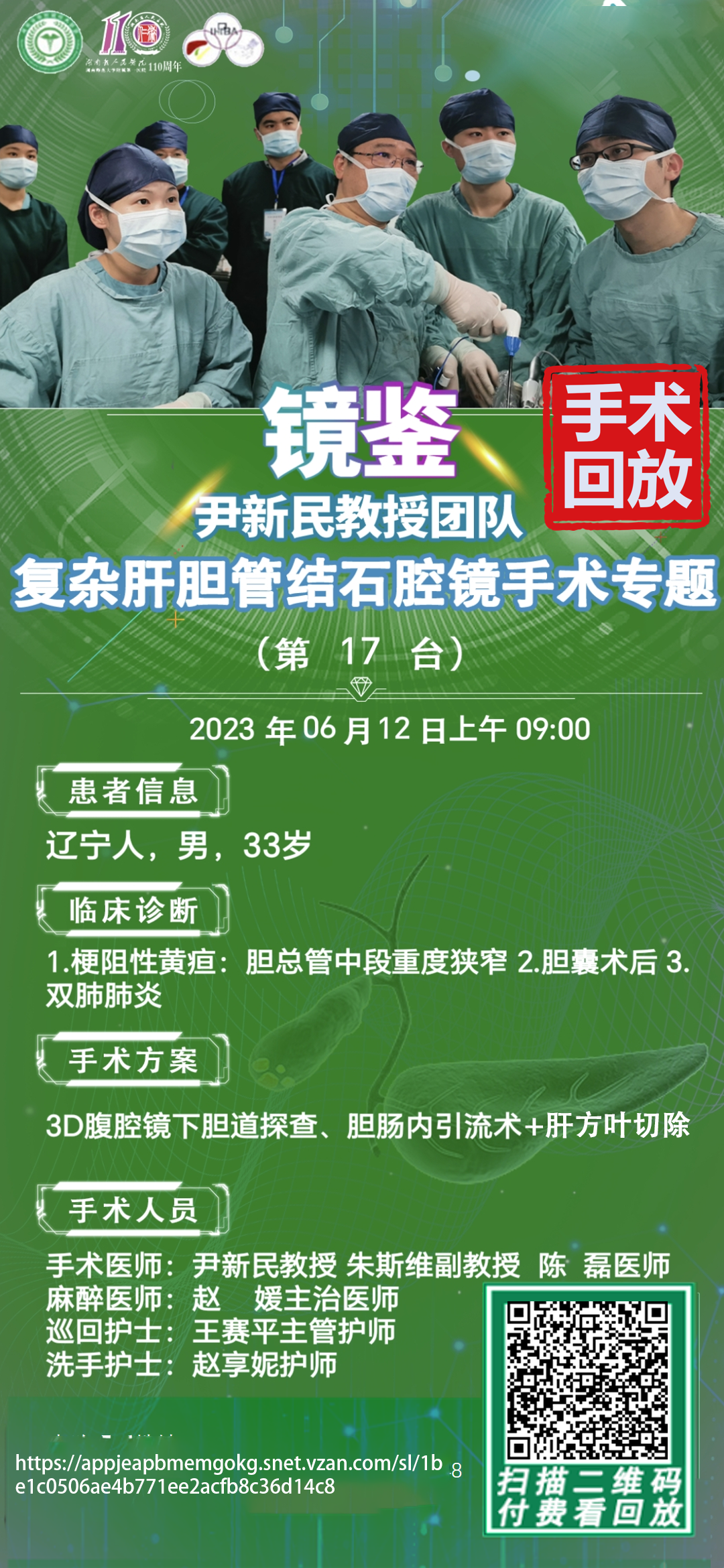 尹新民教授团队复杂肝胆管结石第17台 | 3D腹腔镜胆总道探查、胆肠内引流术 |1. 梗阻性黄疸:胆总管中段重度狭窄 2.胆囊术后 3.双肺肺炎 |20230612
