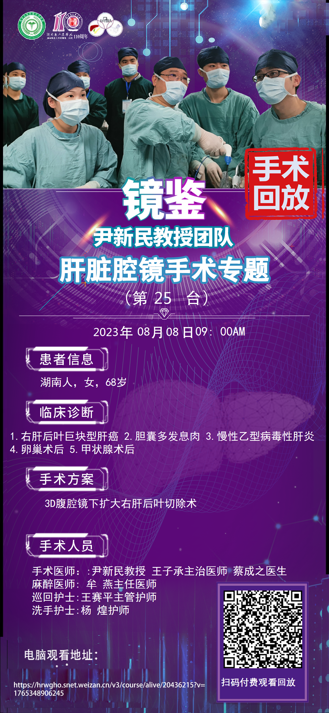 尹新民教授团队四期肝脏腔镜手术第25台|3D腹腔镜下右肝后叶扩大切除术|1. 右肝巨块型肝癌 2.慢性乙型病毒性肝炎 3.胆囊多发息肉 4.卵巢术后 5.甲状腺术后|20230808