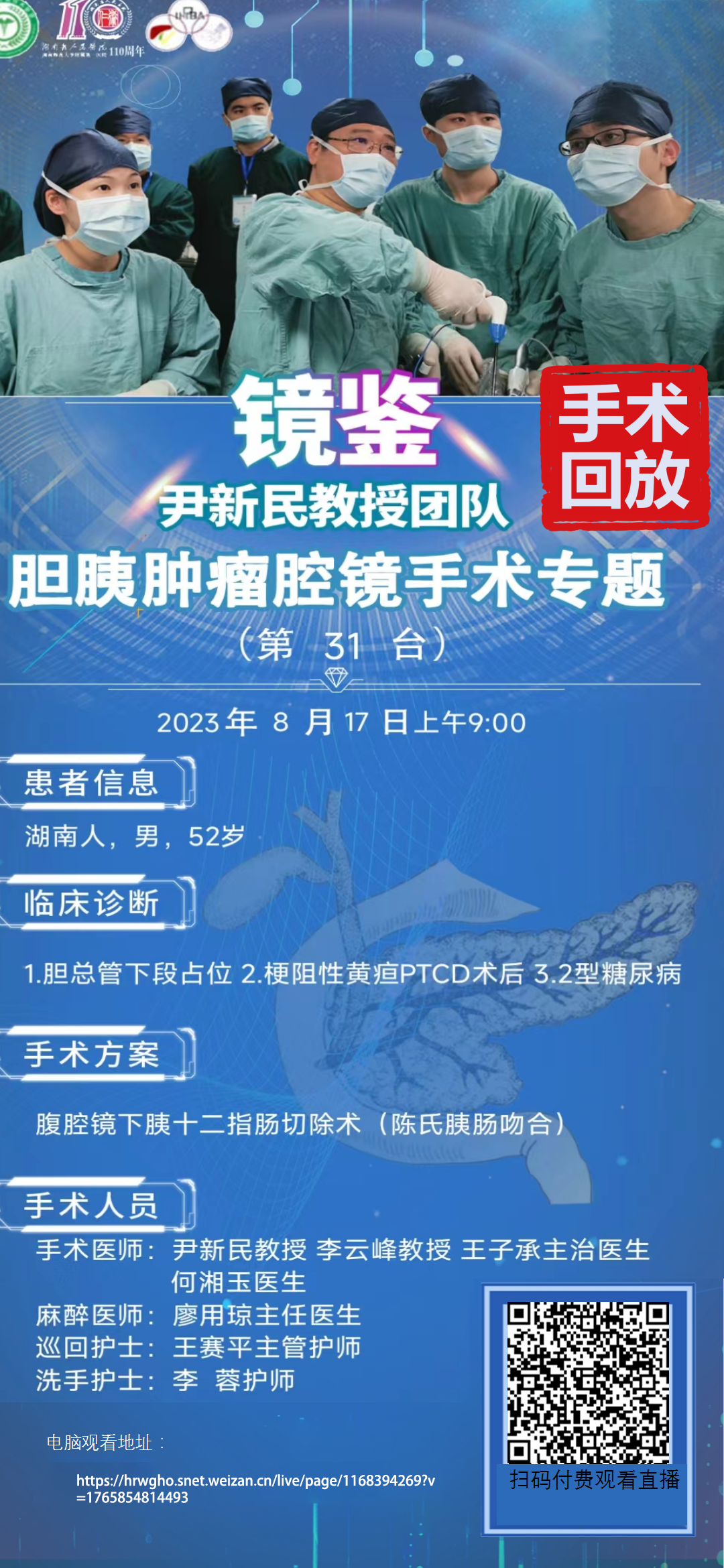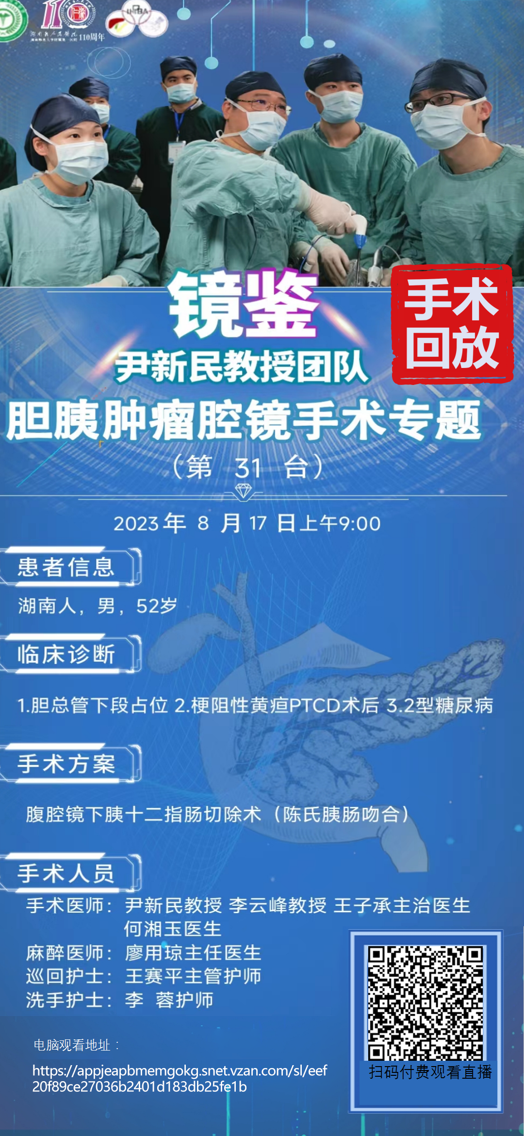 尹新民教授团队胆胰肿瘤专题第31台|腹腔镜下胰十二指肠切除术(陈氏胰肠吻合)|1.胆总管下段占位 2.梗阻性黄疸PTCD术后3.2型糖尿病|20230817