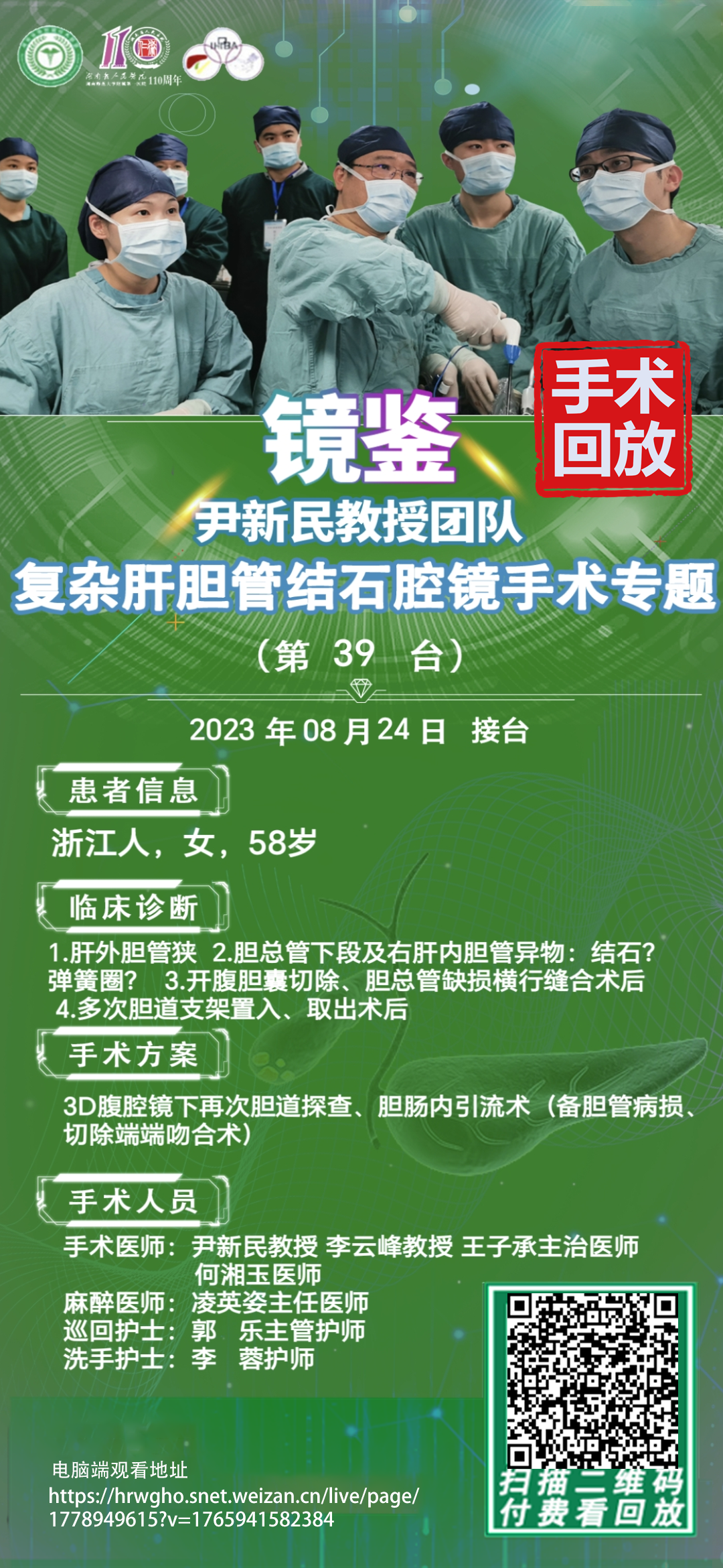 尹新民教授团队复杂肝胆管结石第39台|3D腹腔镜下再次胆道探查胆肠内引流术备胆管病损切除端端吻合术|肝外胆管狭窄胆总管下端及右肝内胆管异物结石弹簧圈开腹胆囊切除胆总管缺损横行缝合术|20230824