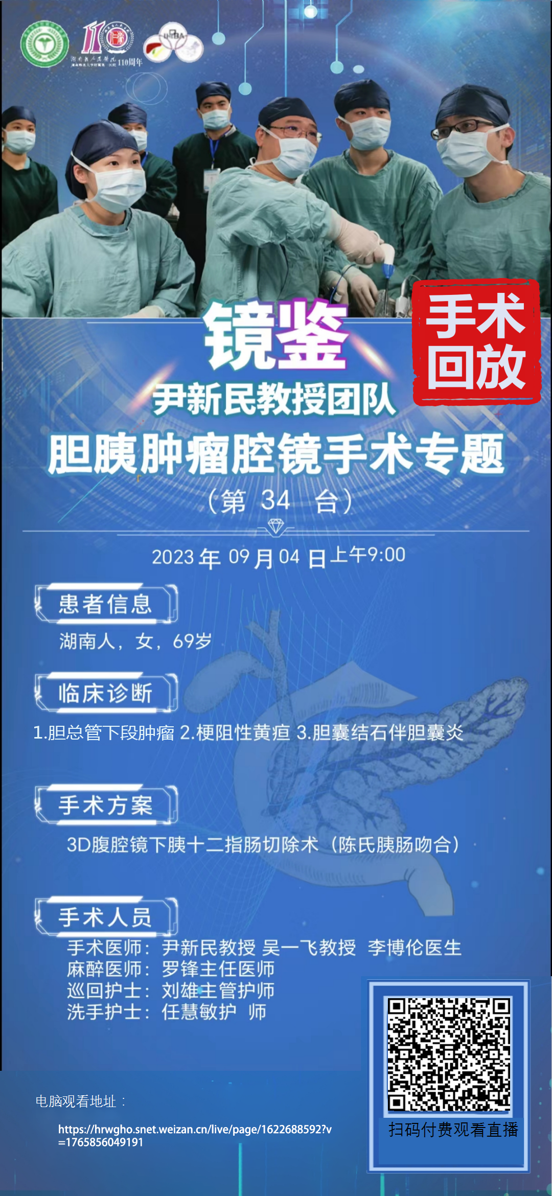 尹新民教授团队-四期胆胰肿瘤腔镜手术-第34台|3D腹腔镜下胰十二指肠切除术(陈氏胰肠吻合)|1.法特壶腹肿瘤 2.梗阻性黄疸 3.胆囊结石伴胆囊炎|20230904