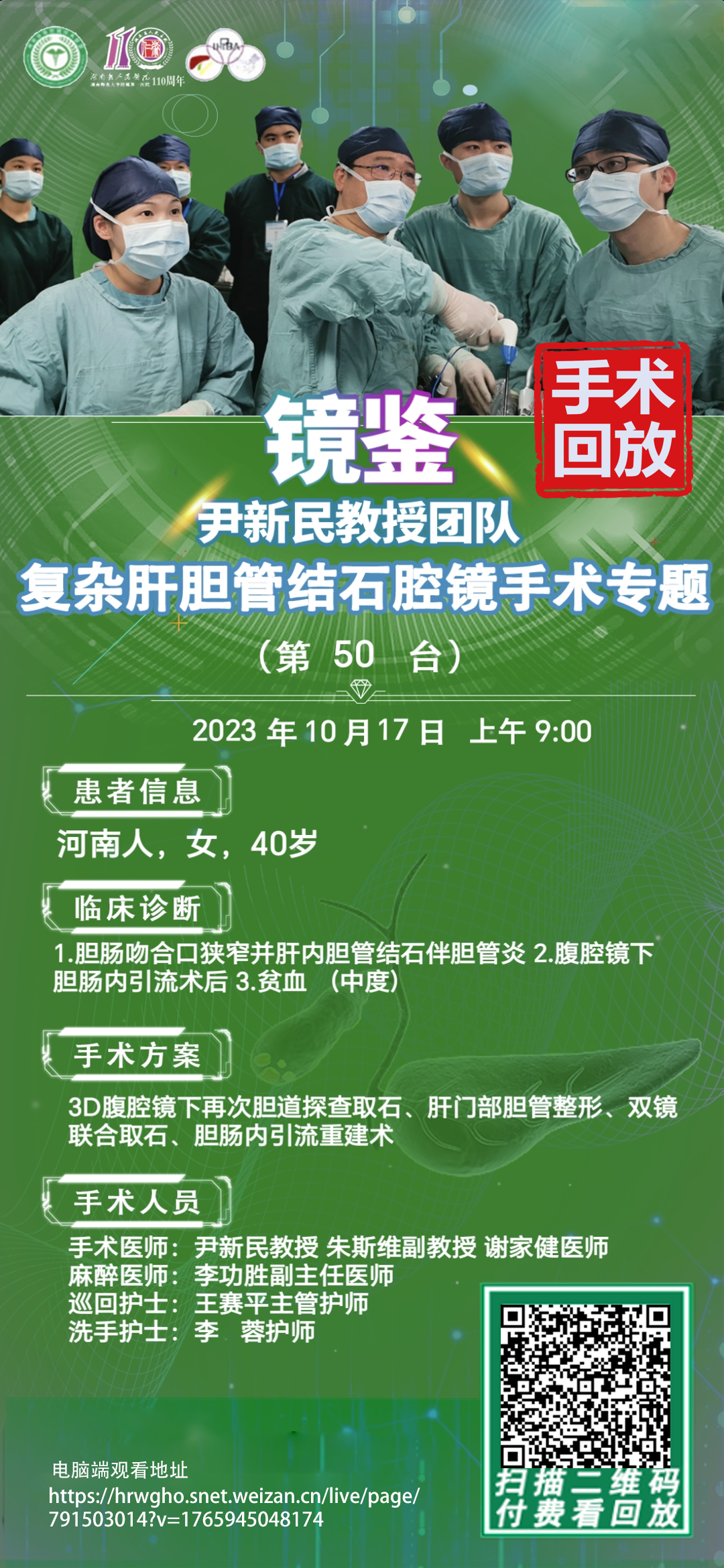 尹新民教授团队-复杂肝胆管结石腔镜手术-第50台|3D腹腔镜下再次胆道探查、肝门胆管整形、双镜联合取石、胆肠内引流重建术|20231017