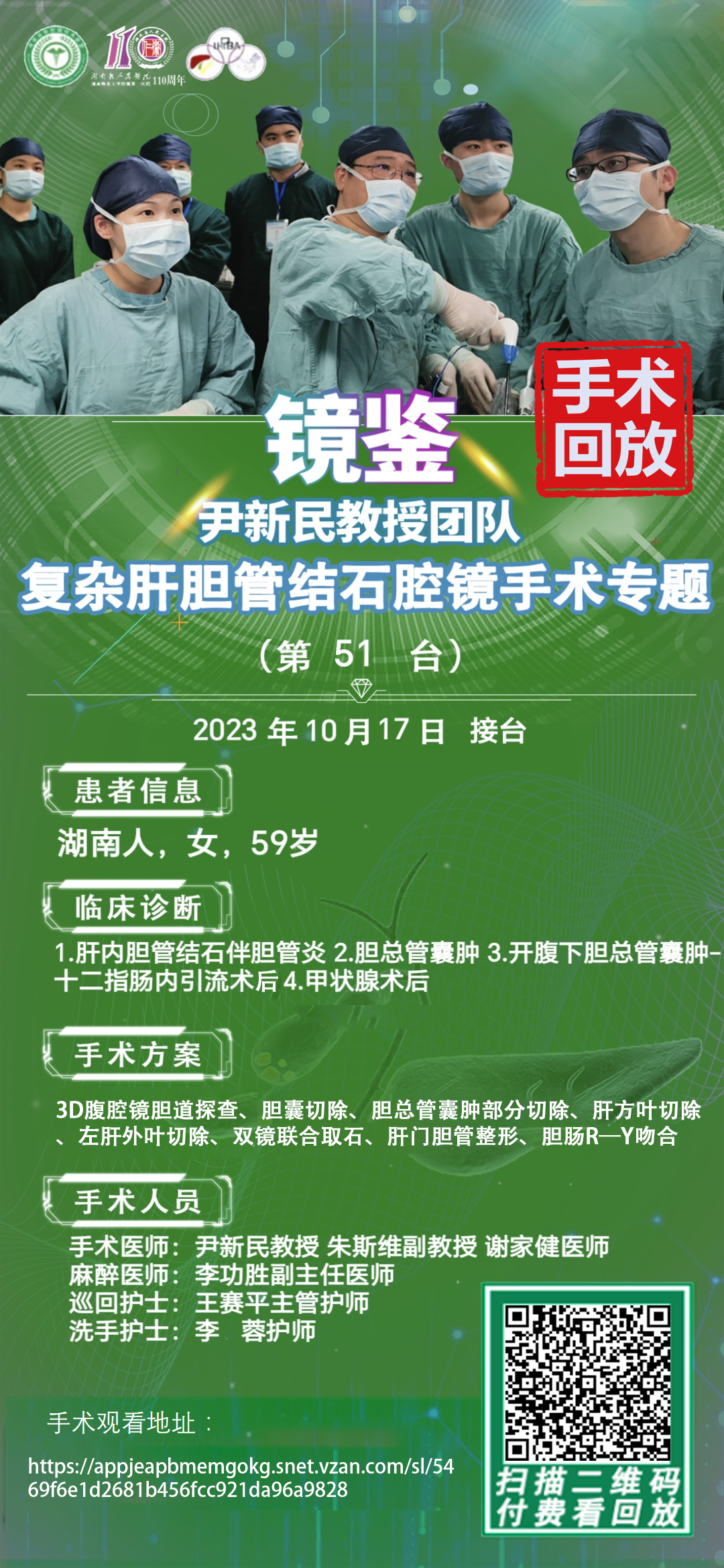 尹新民教授团队-复杂肝胆管结石腔镜手术-第50台|3D腹腔镜下再次胆道探查、肝门胆管整形、双镜联合取石、胆肠内引流重建术|20231017