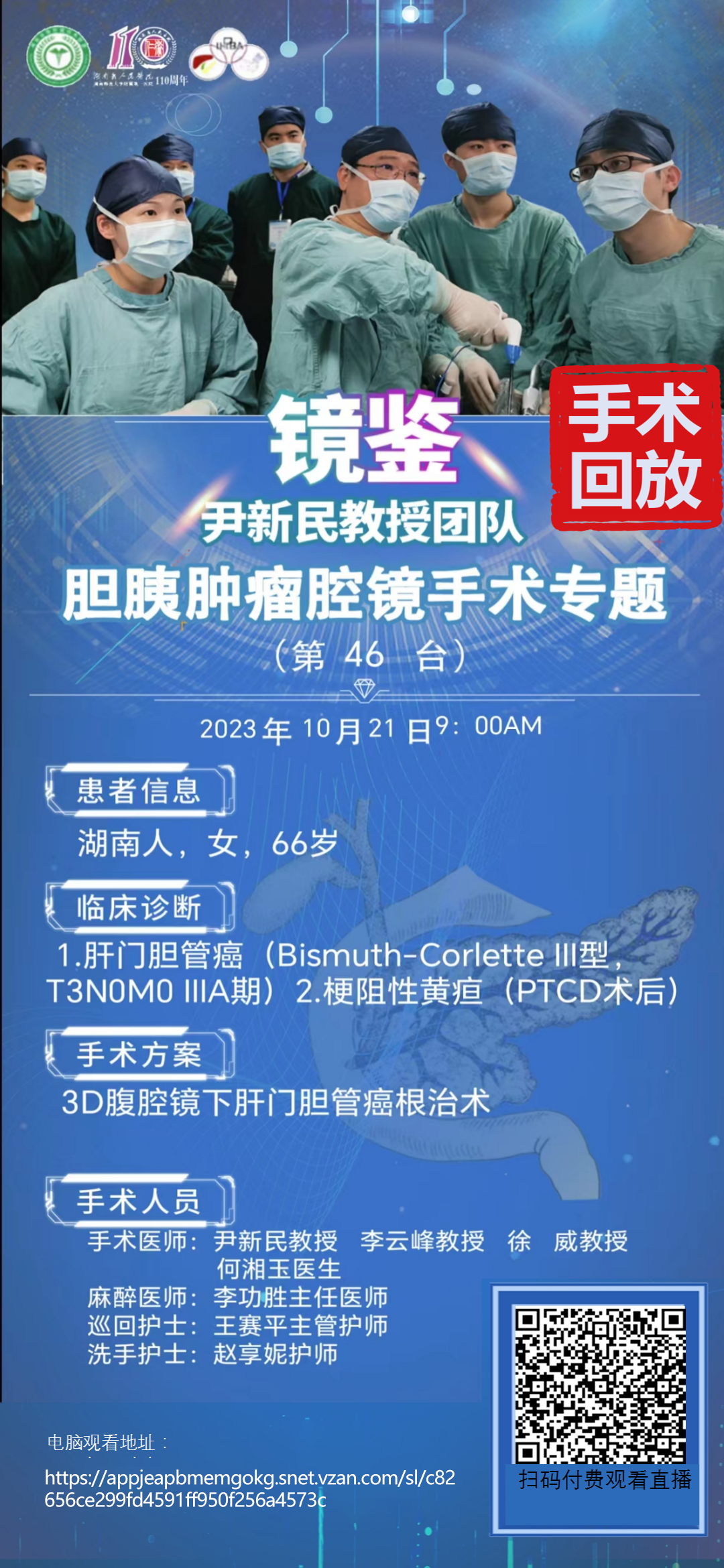 尹新民教授团队-四期胆胰肿瘤腔镜手术-第46台|3D腹腔镜肝门胆管癌根治术|1.肝门胆管癌(Bismuth-Corlette III型)2.梗阻性黄疸(PTCD术后)|20231121
