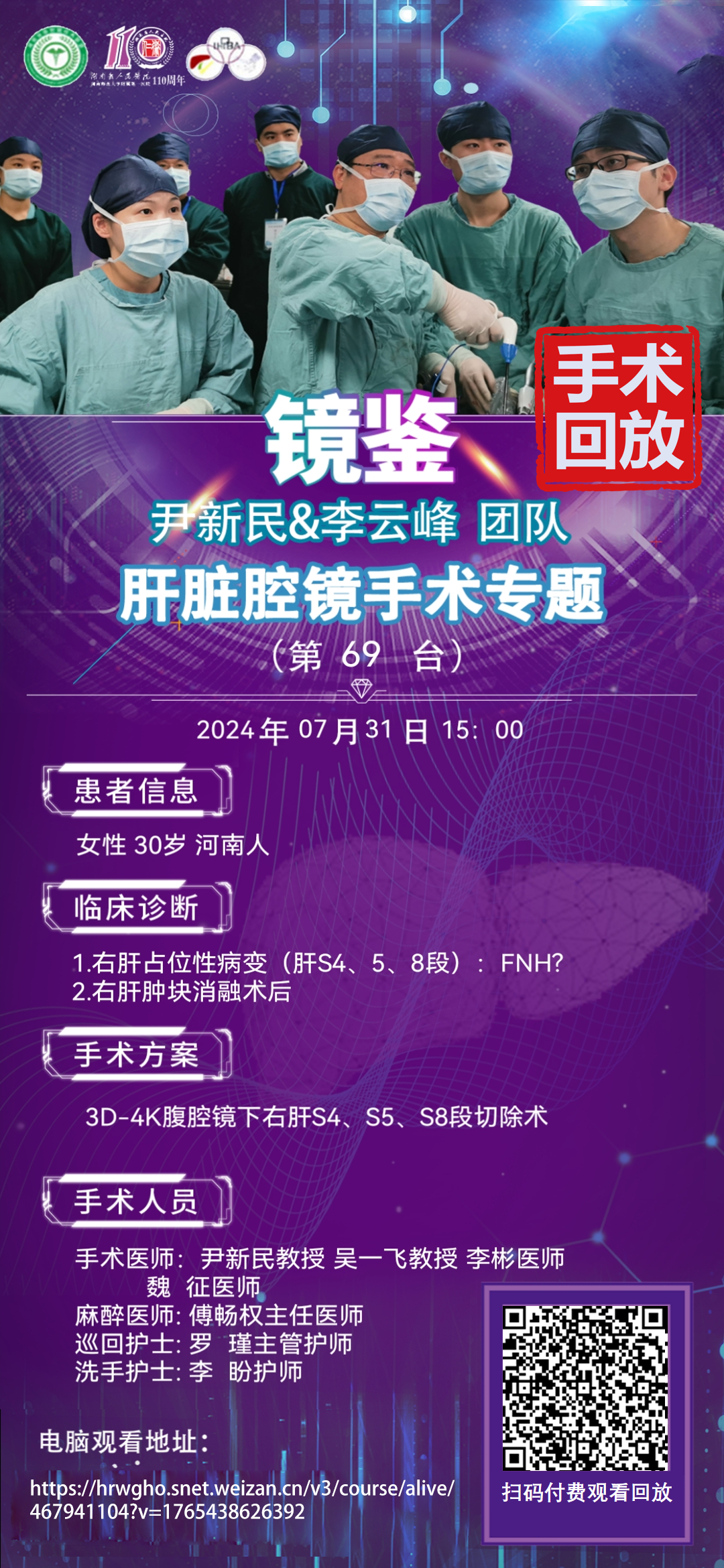 尹新民教授团队第69台肝脏|3D-4K腹腔镜下右肝S4、S5、S8段切除术|1.右肝占位性病变(肝S4、5、8段):FNH? 2.右肝肿块消融术后|20240731